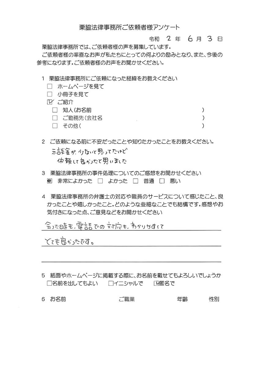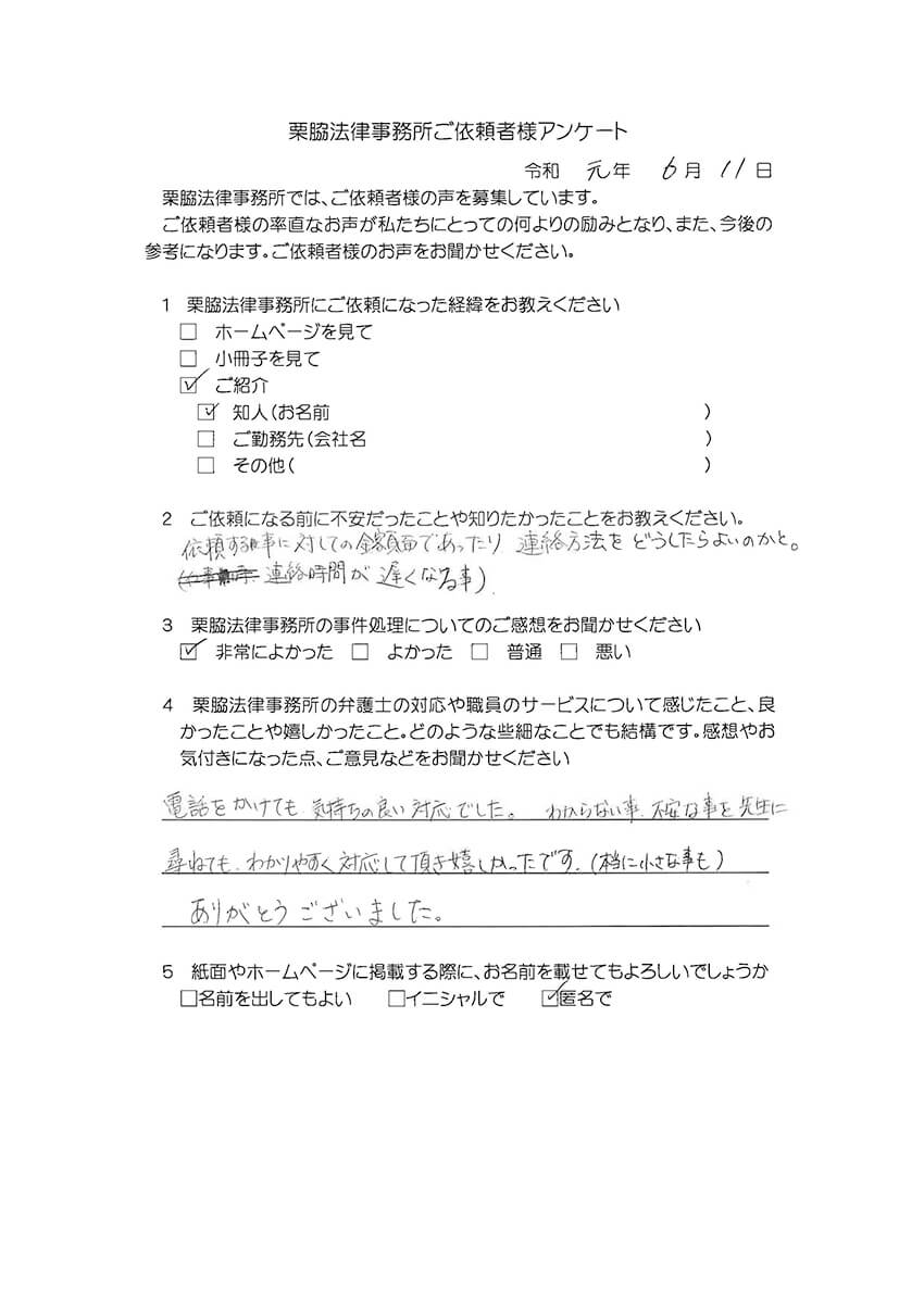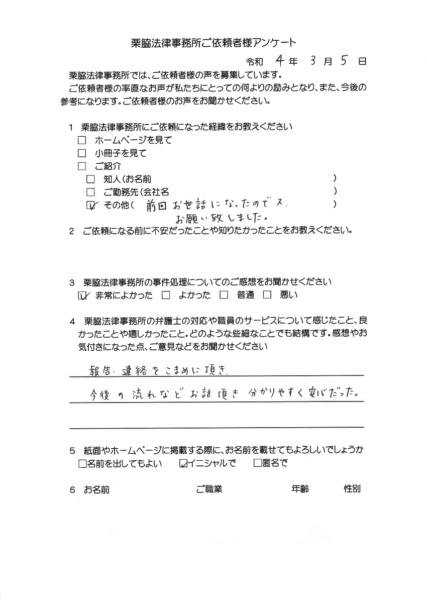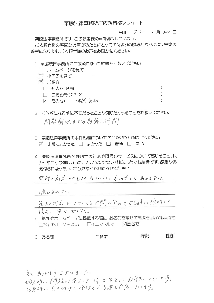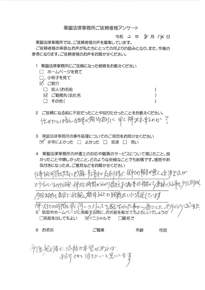 仕事柄、弁護士先生にお願いする案件が多々ありますが、途中での報告が無く進捗状況がどうなっているのか不安・解決に時間がかかり過ぎて不満等依頼者から連絡が入る事も少なくありません。今回初めて自分で経験し、期待以上の結果に大いに満足しています。解決までの時間も早く、何一つストレスを感じなかった事が一番でした。ありがとうございました。