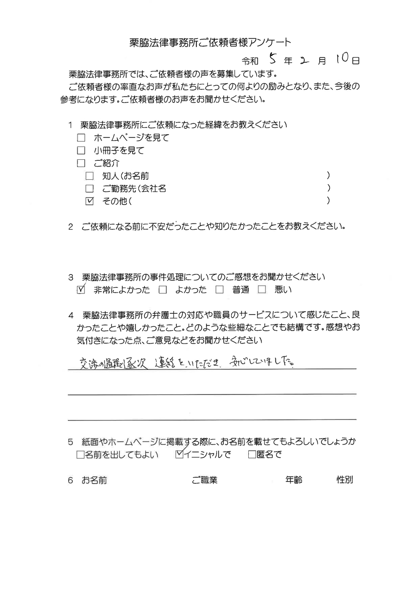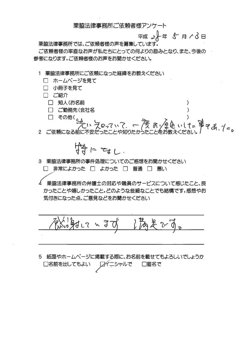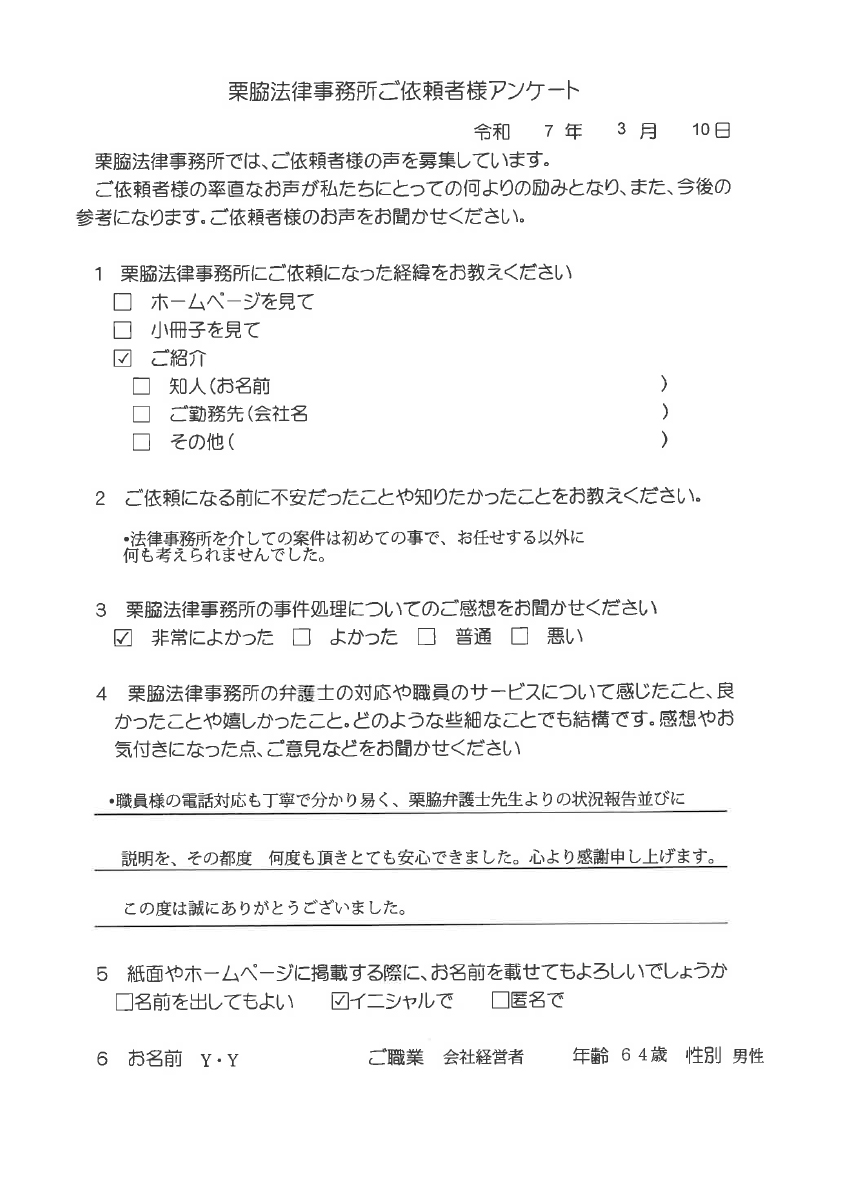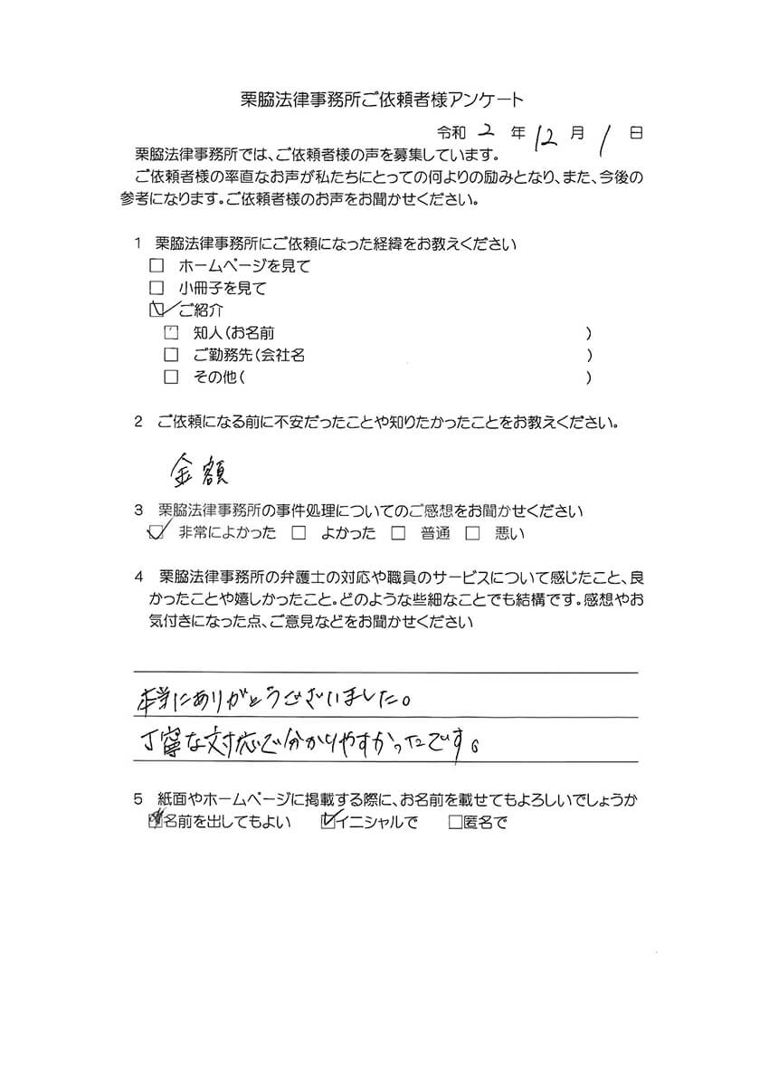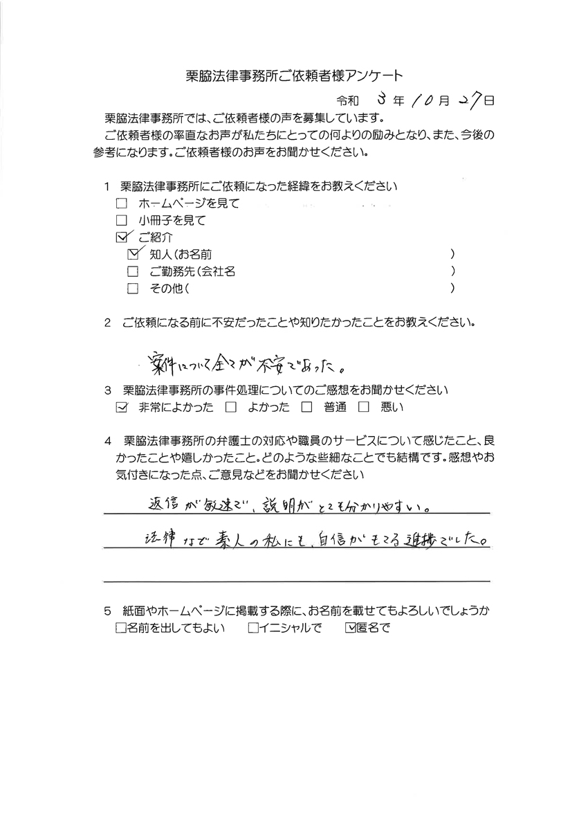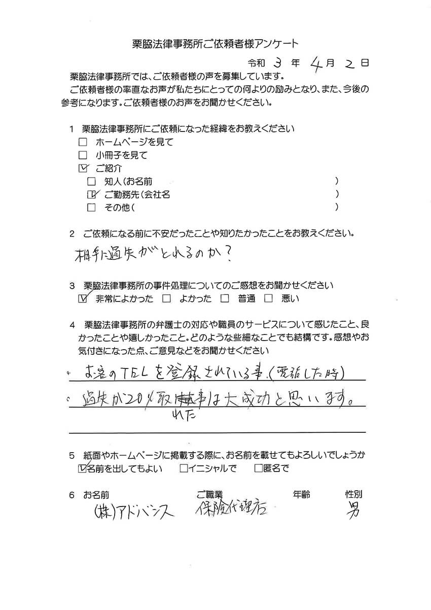 仕事柄、弁護士先生にお願いする案件が多々ありますが、途中での報告が無く進捗状況がどうなっているのか不安・解決に時間がかかり過ぎて不満等依頼者から連絡が入る事も少なくありません。今回初めて自分で経験し、期待以上の結果に大いに満足しています。解決までの時間も早く、何一つストレスを感じなかった事が一番でした。ありがとうございました。
