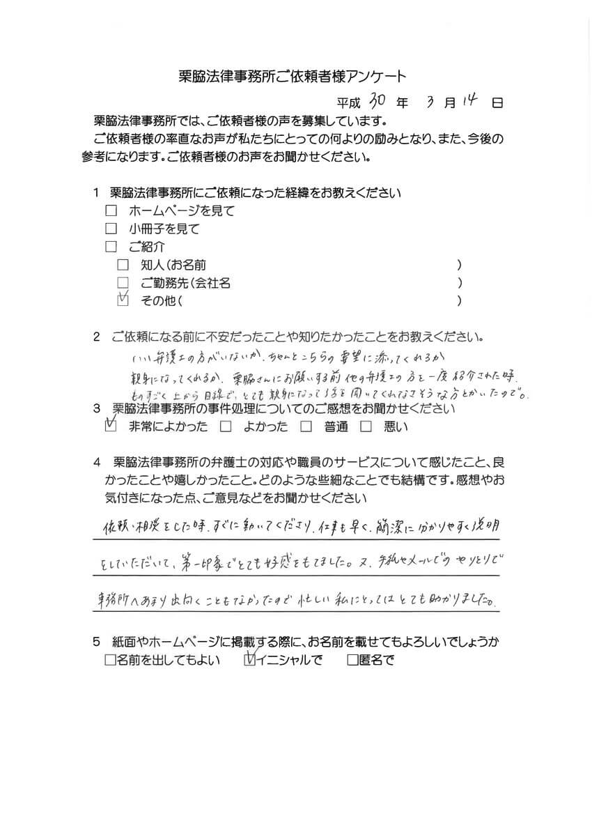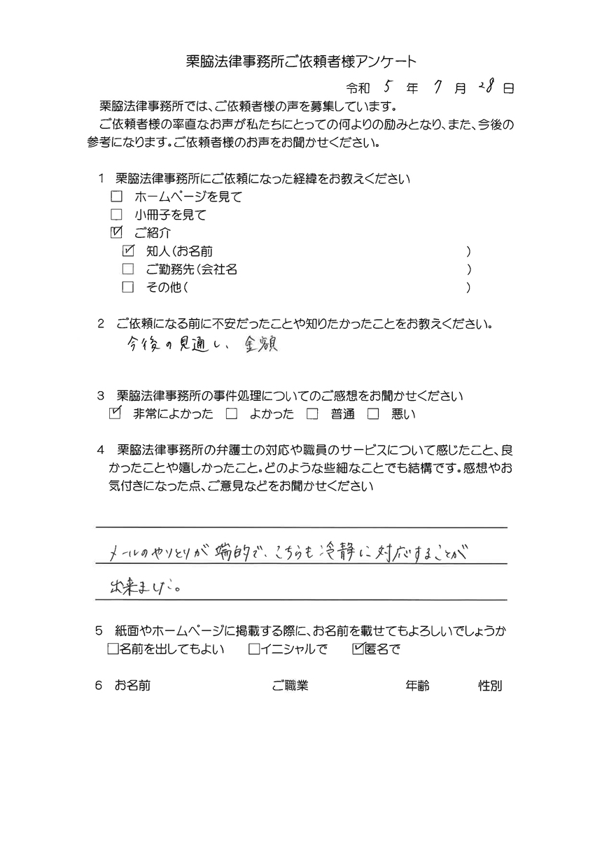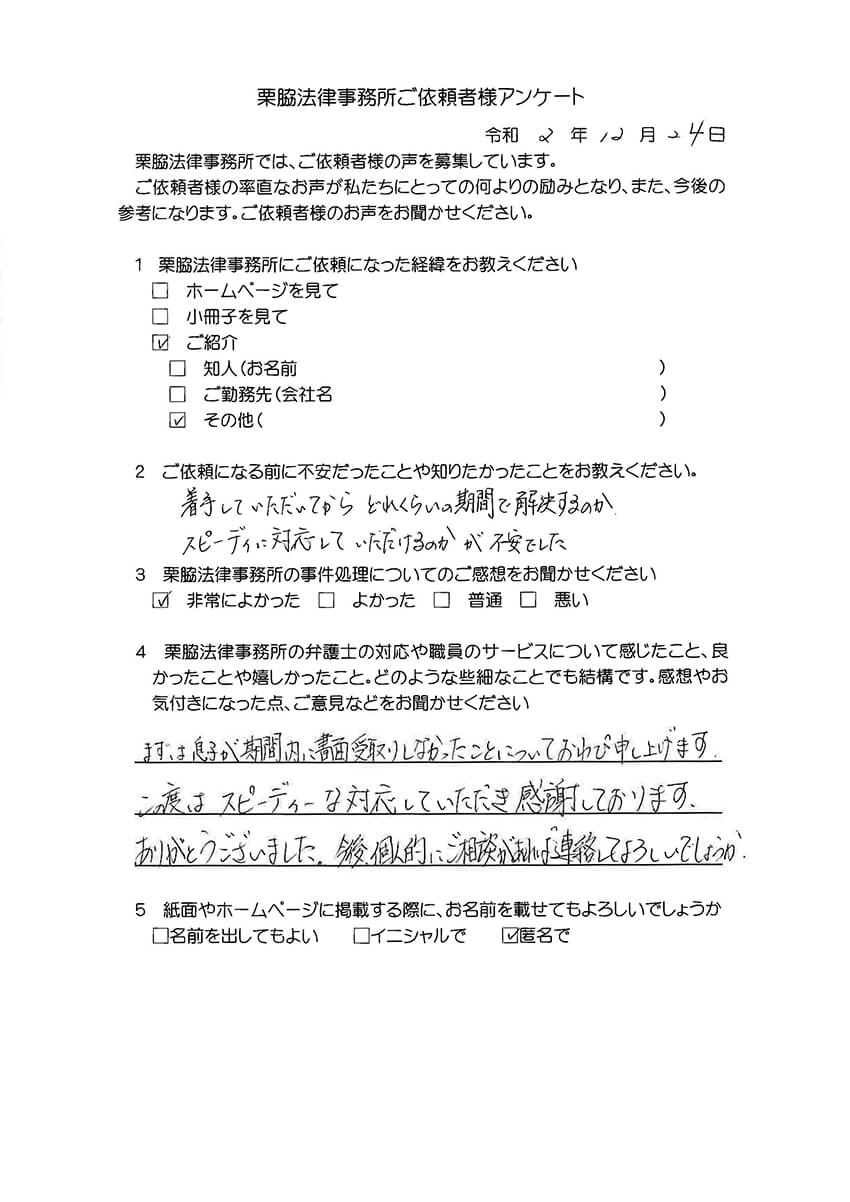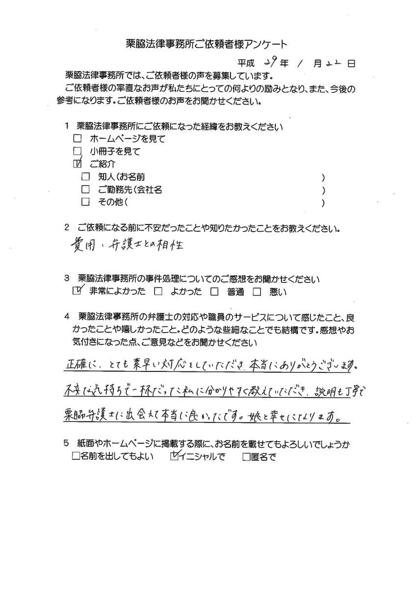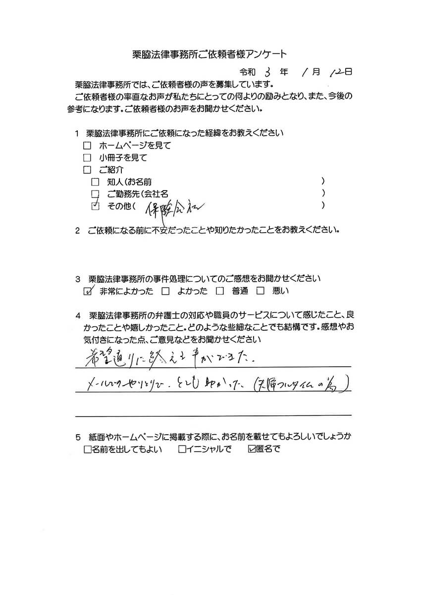 仕事柄、弁護士先生にお願いする案件が多々ありますが、途中での報告が無く進捗状況がどうなっているのか不安・解決に時間がかかり過ぎて不満等依頼者から連絡が入る事も少なくありません。今回初めて自分で経験し、期待以上の結果に大いに満足しています。解決までの時間も早く、何一つストレスを感じなかった事が一番でした。ありがとうございました。