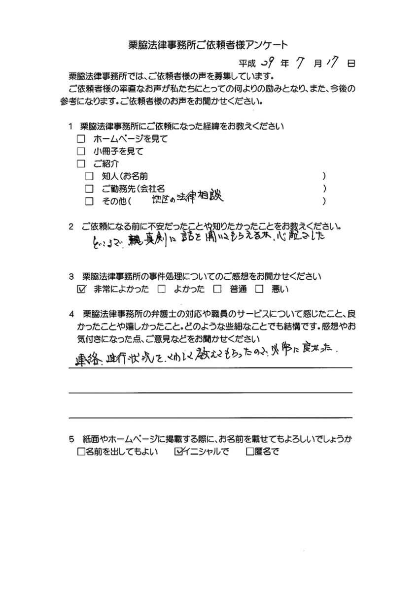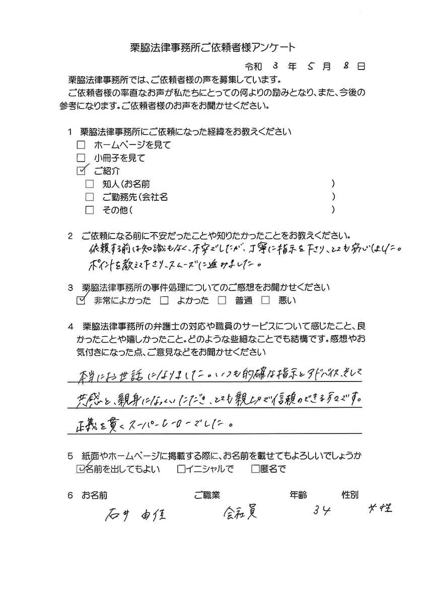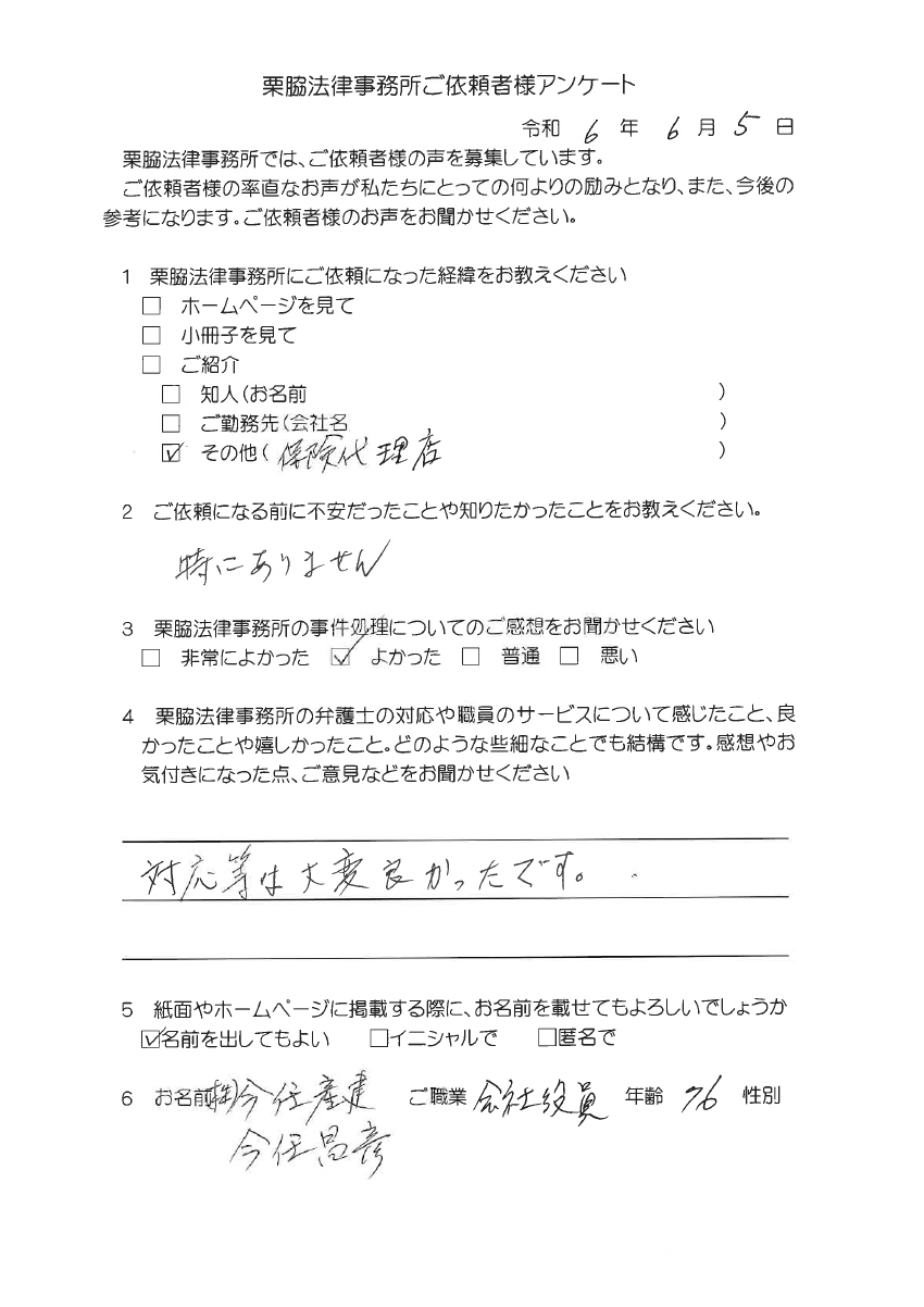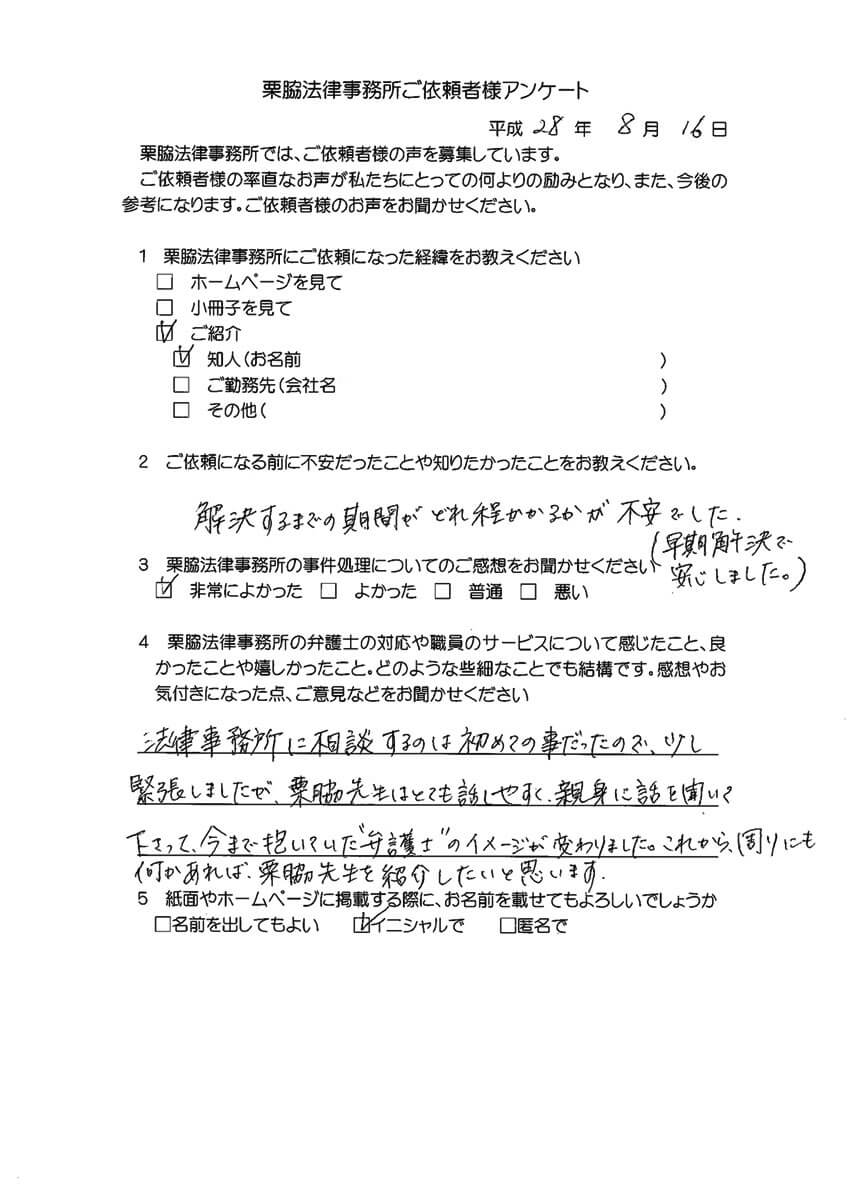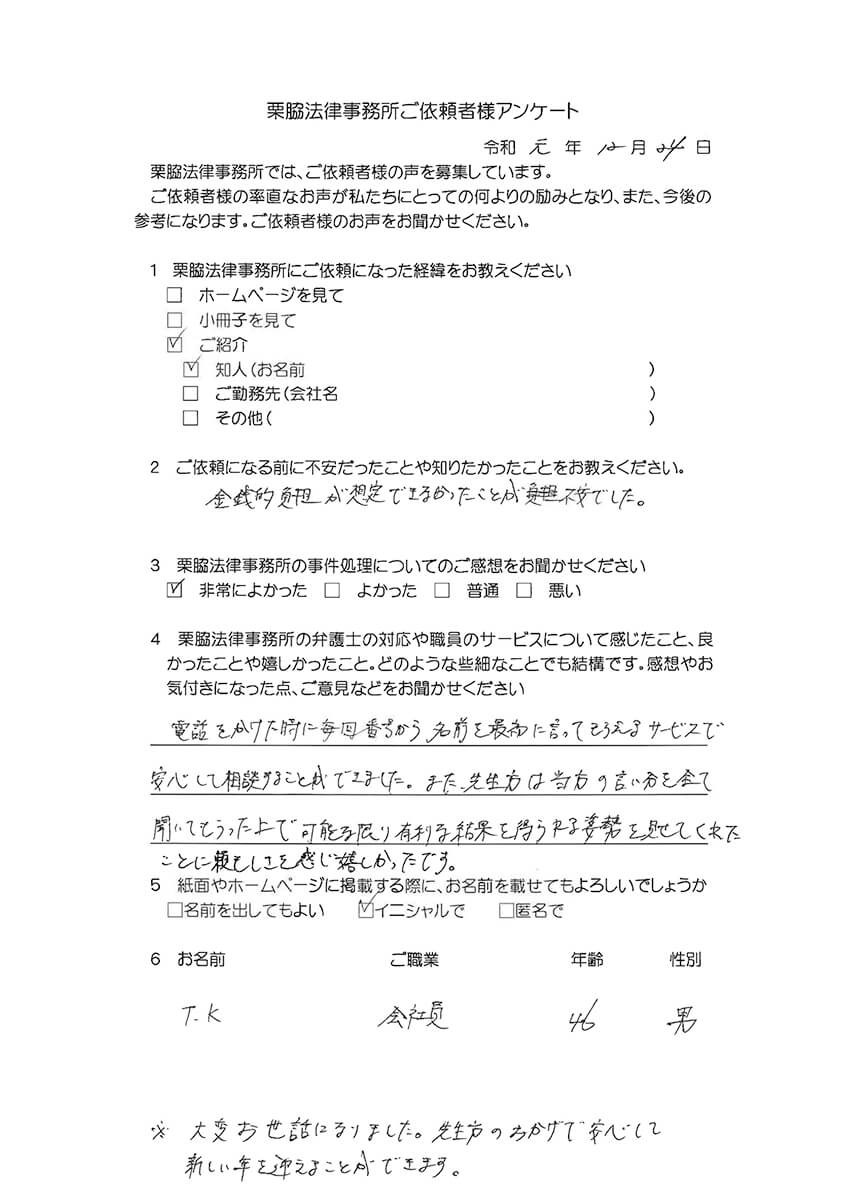仕事柄、弁護士先生にお願いする案件が多々ありますが、途中での報告が無く進捗状況がどうなっているのか不安・解決に時間がかかり過ぎて不満等依頼者から連絡が入る事も少なくありません。今回初めて自分で経験し、期待以上の結果に大いに満足しています。解決までの時間も早く、何一つストレスを感じなかった事が一番でした。ありがとうございました。