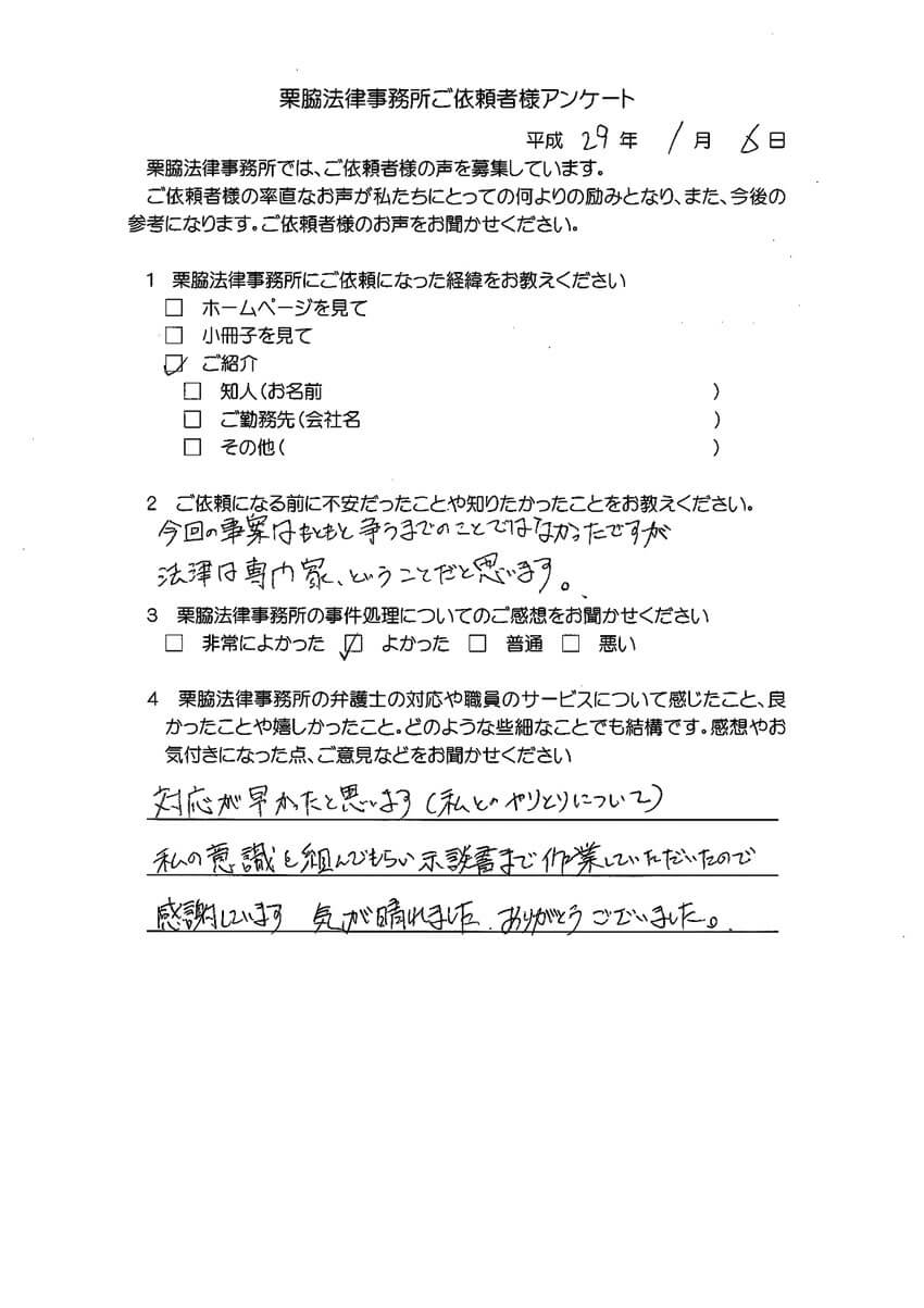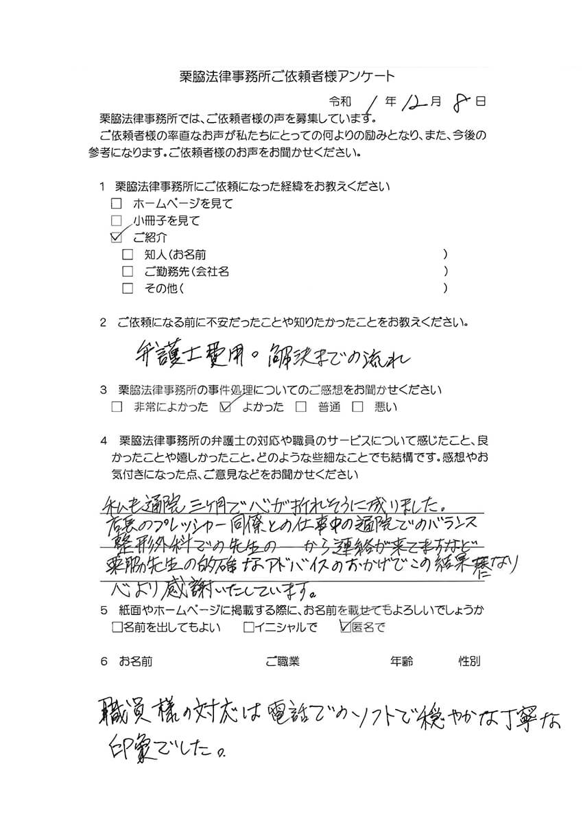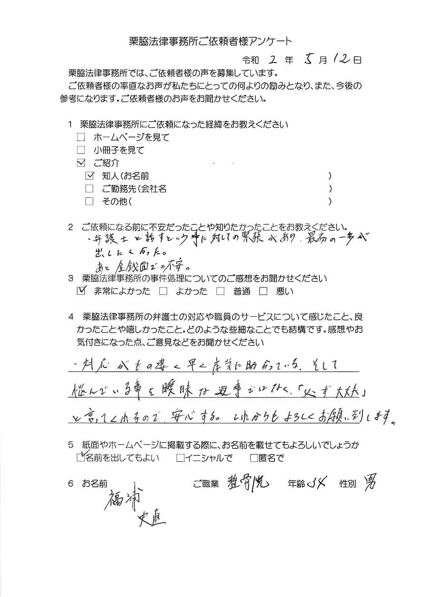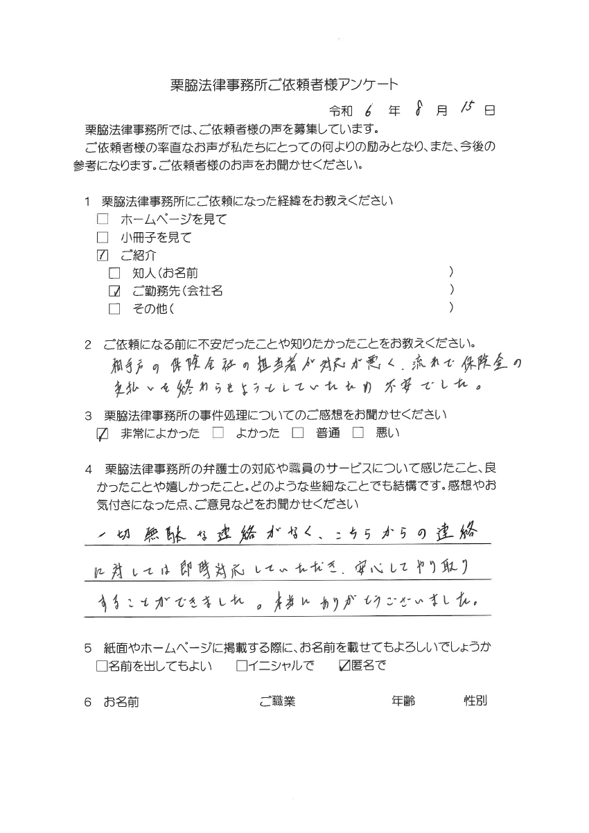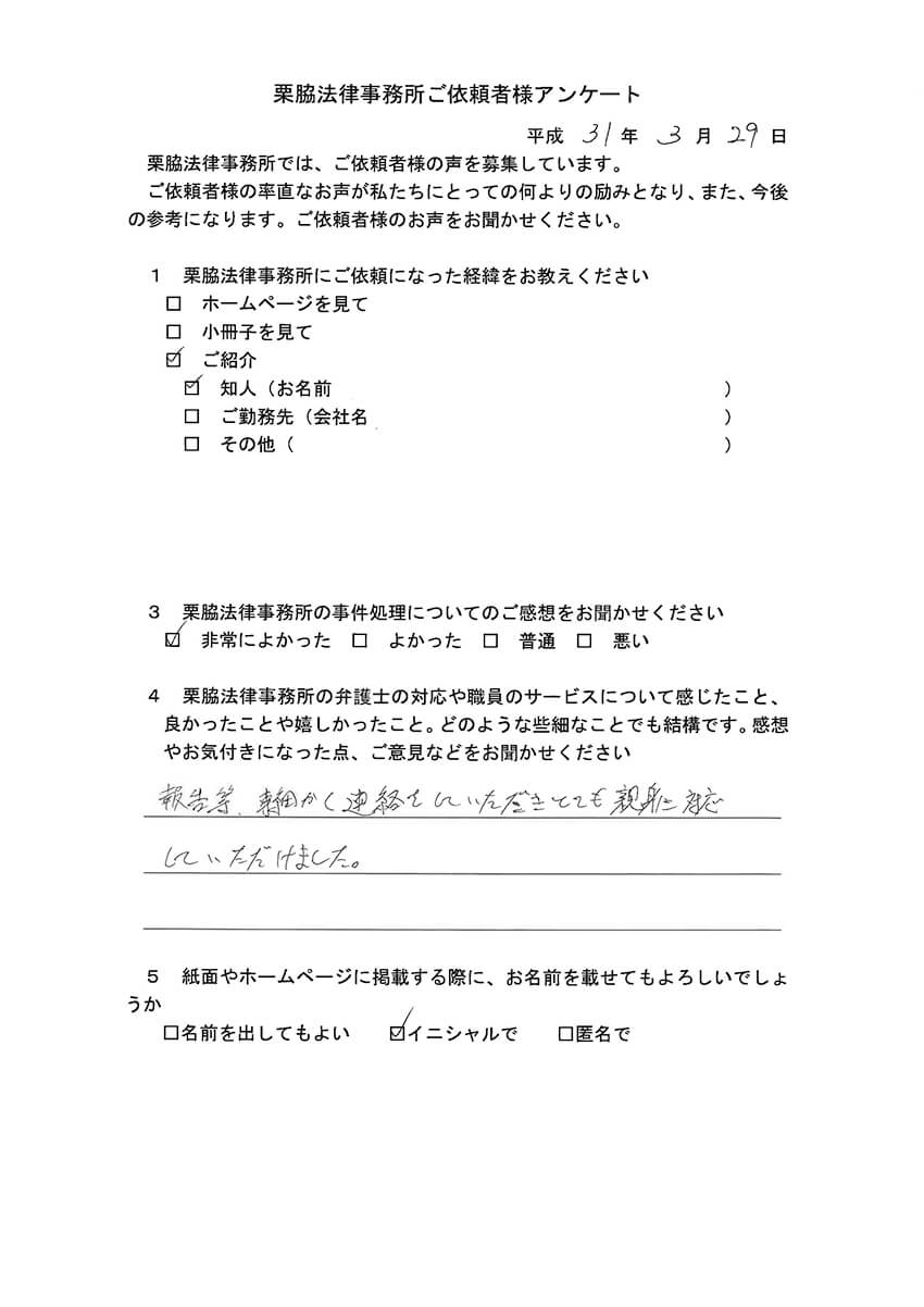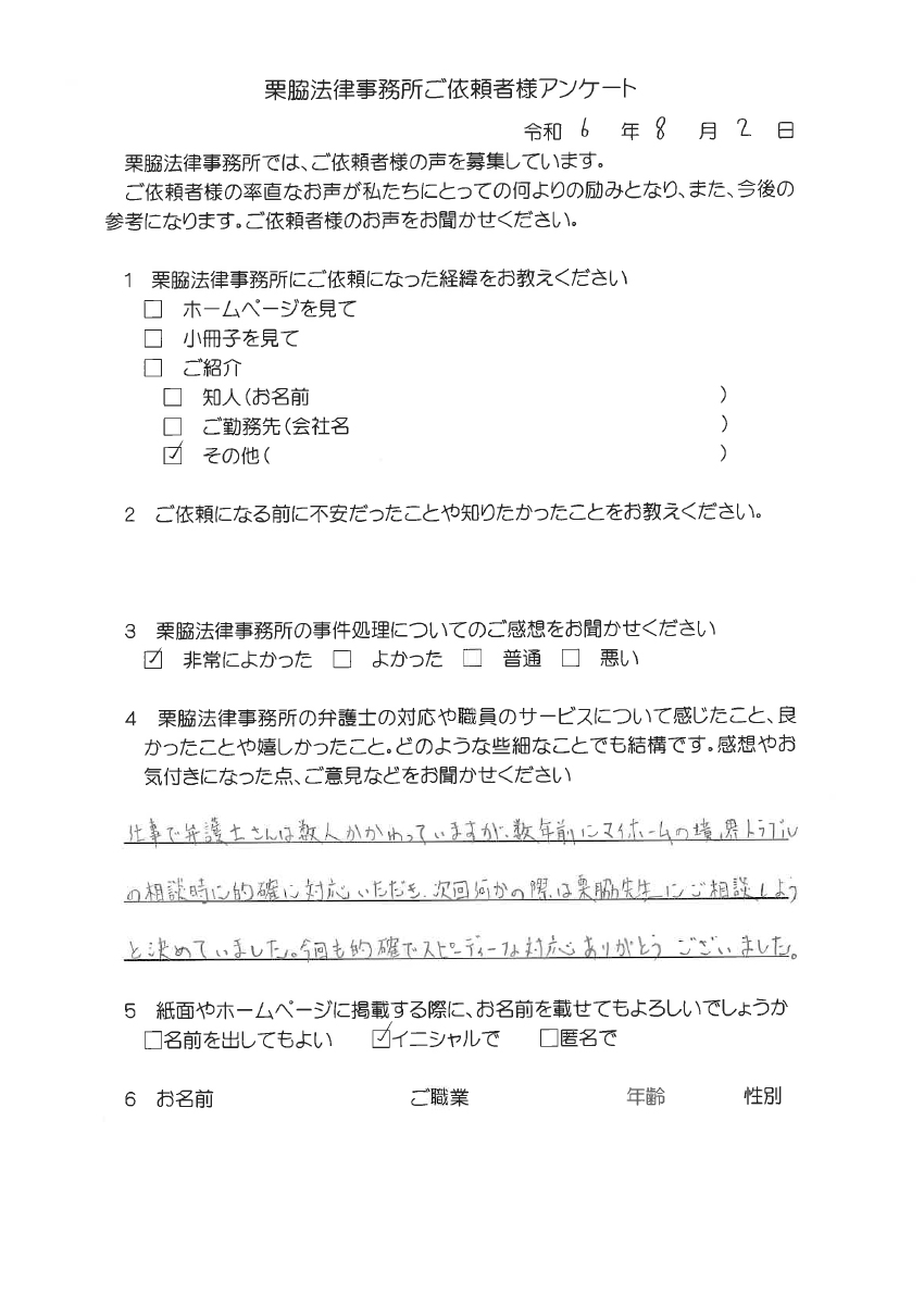 仕事柄、弁護士先生にお願いする案件が多々ありますが、途中での報告が無く進捗状況がどうなっているのか不安・解決に時間がかかり過ぎて不満等依頼者から連絡が入る事も少なくありません。今回初めて自分で経験し、期待以上の結果に大いに満足しています。解決までの時間も早く、何一つストレスを感じなかった事が一番でした。ありがとうございました。