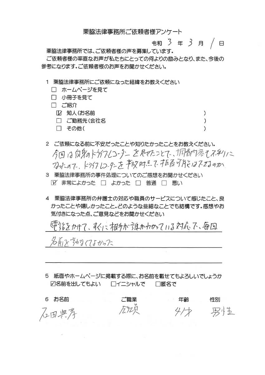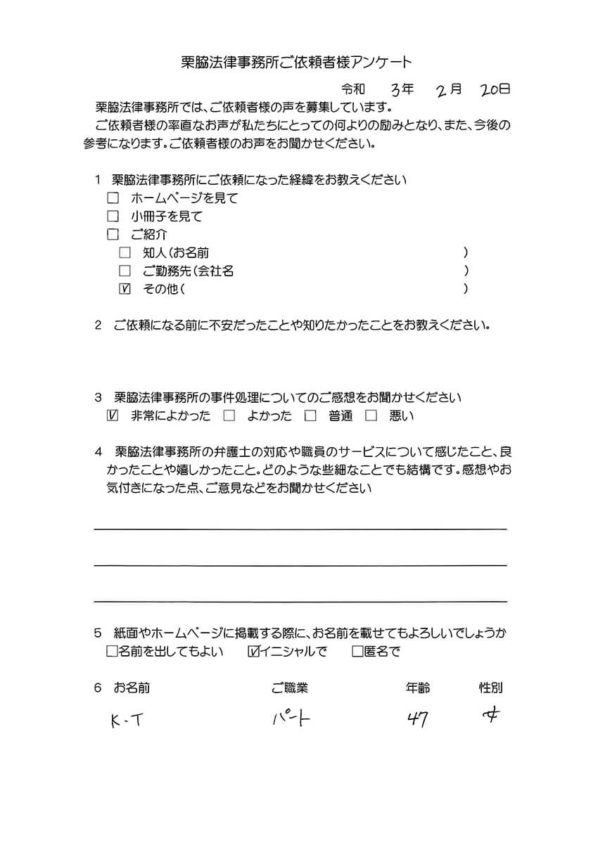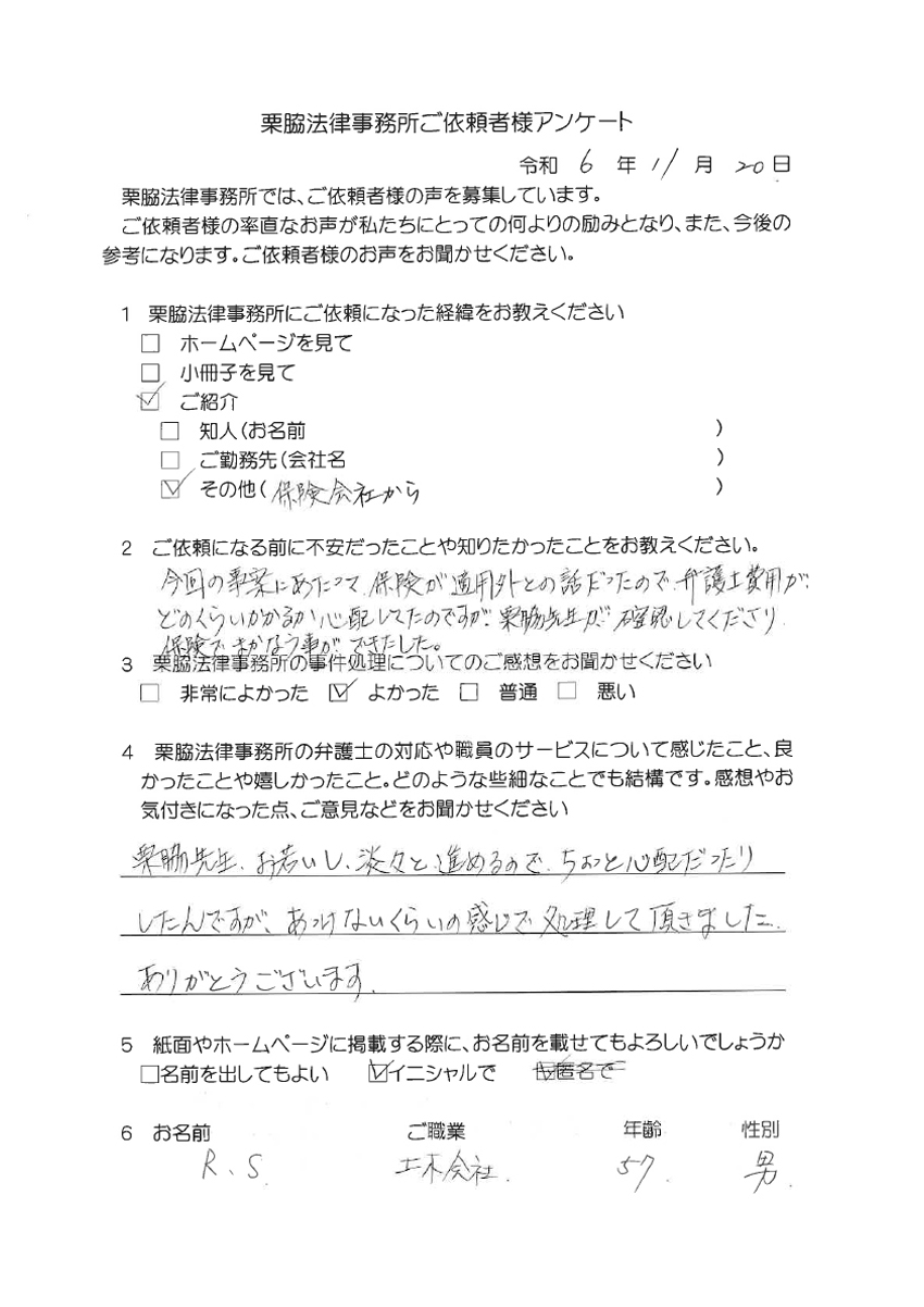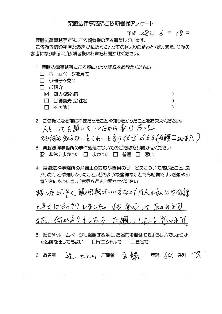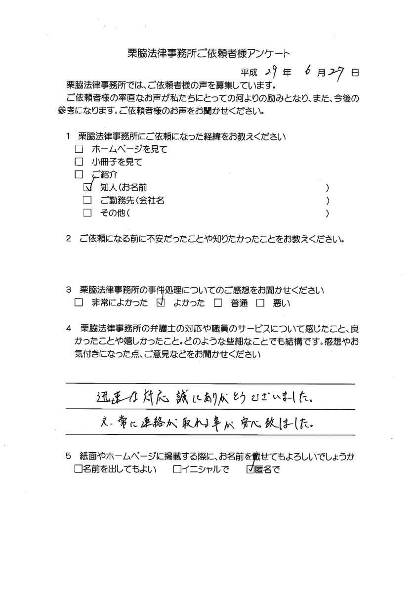 仕事柄、弁護士先生にお願いする案件が多々ありますが、途中での報告が無く進捗状況がどうなっているのか不安・解決に時間がかかり過ぎて不満等依頼者から連絡が入る事も少なくありません。今回初めて自分で経験し、期待以上の結果に大いに満足しています。解決までの時間も早く、何一つストレスを感じなかった事が一番でした。ありがとうございました。