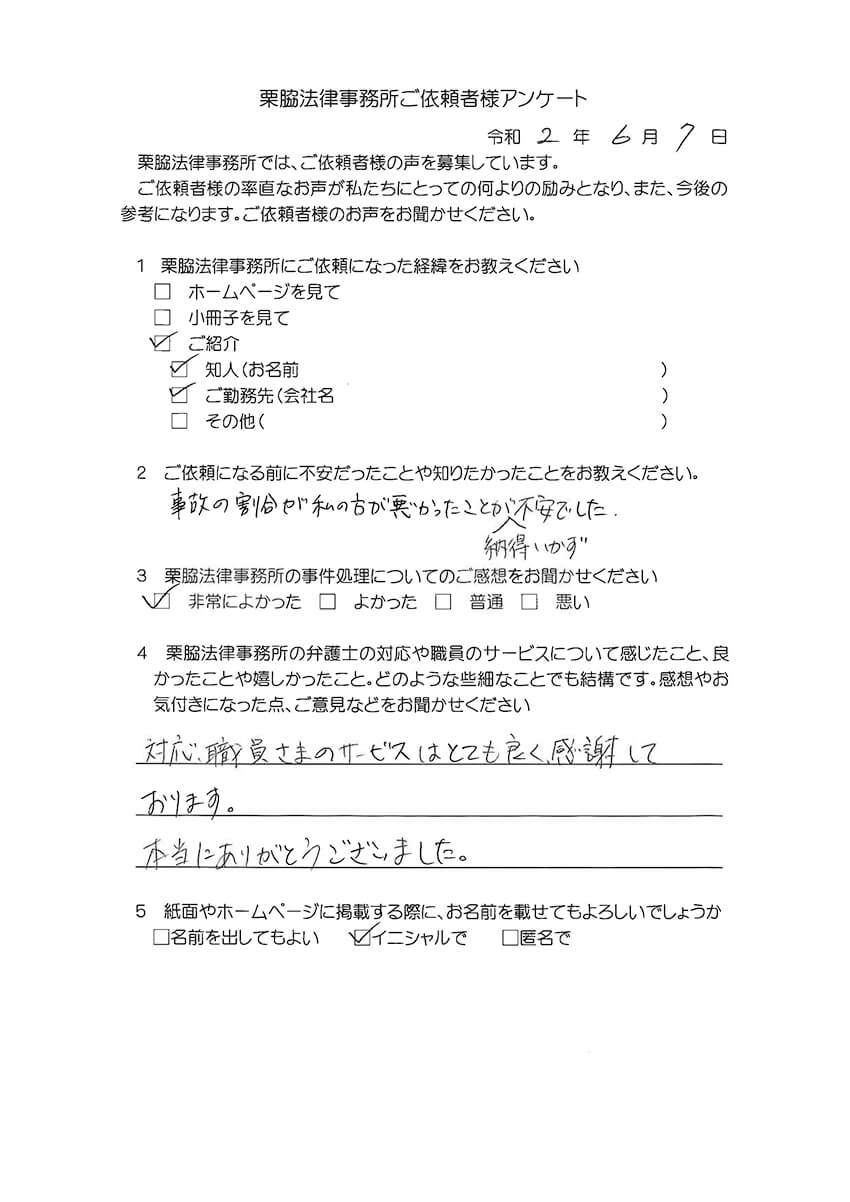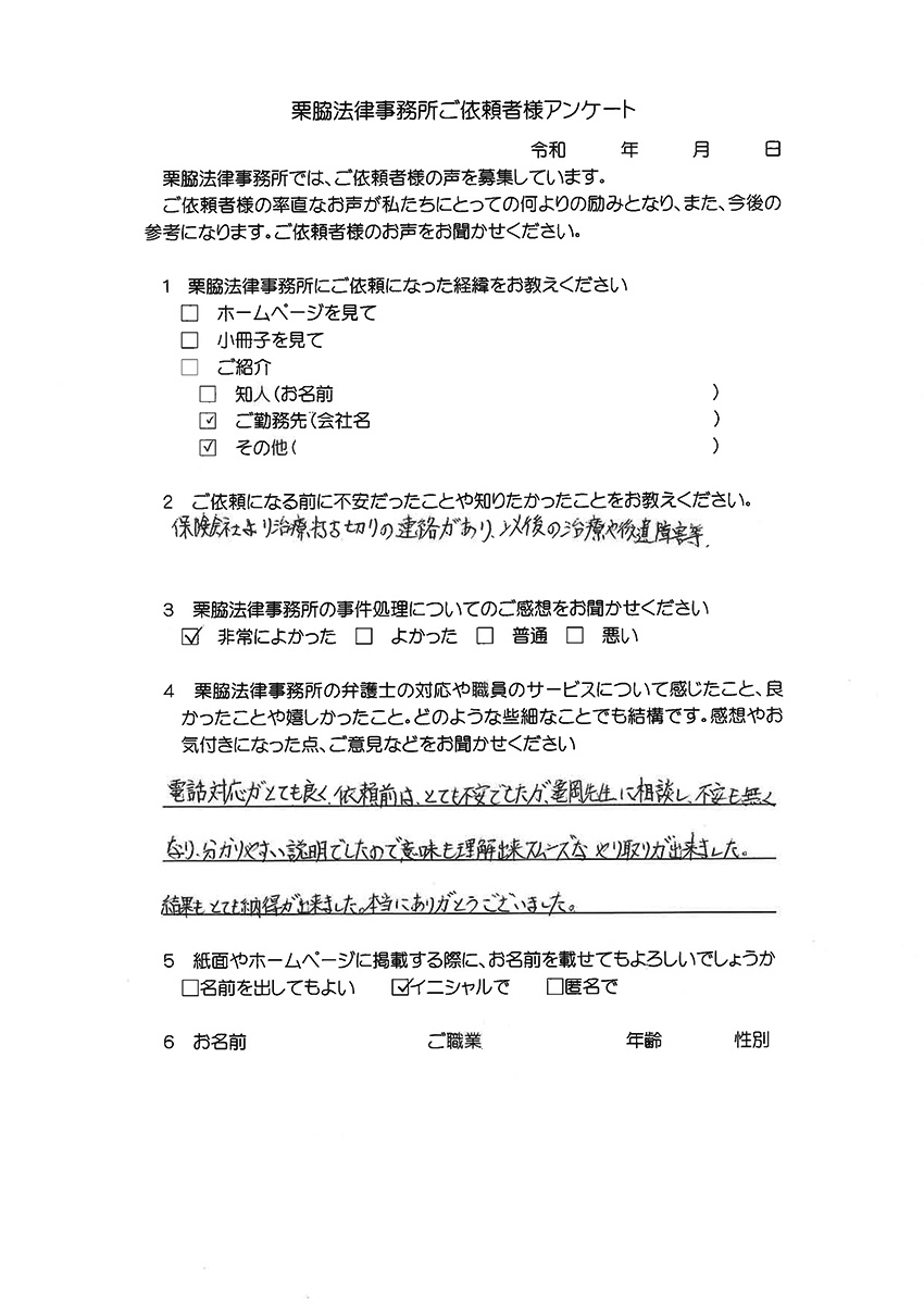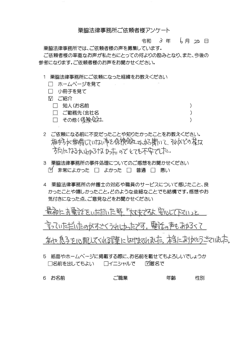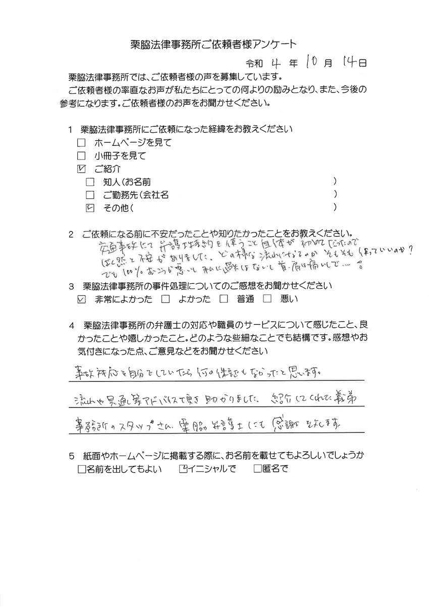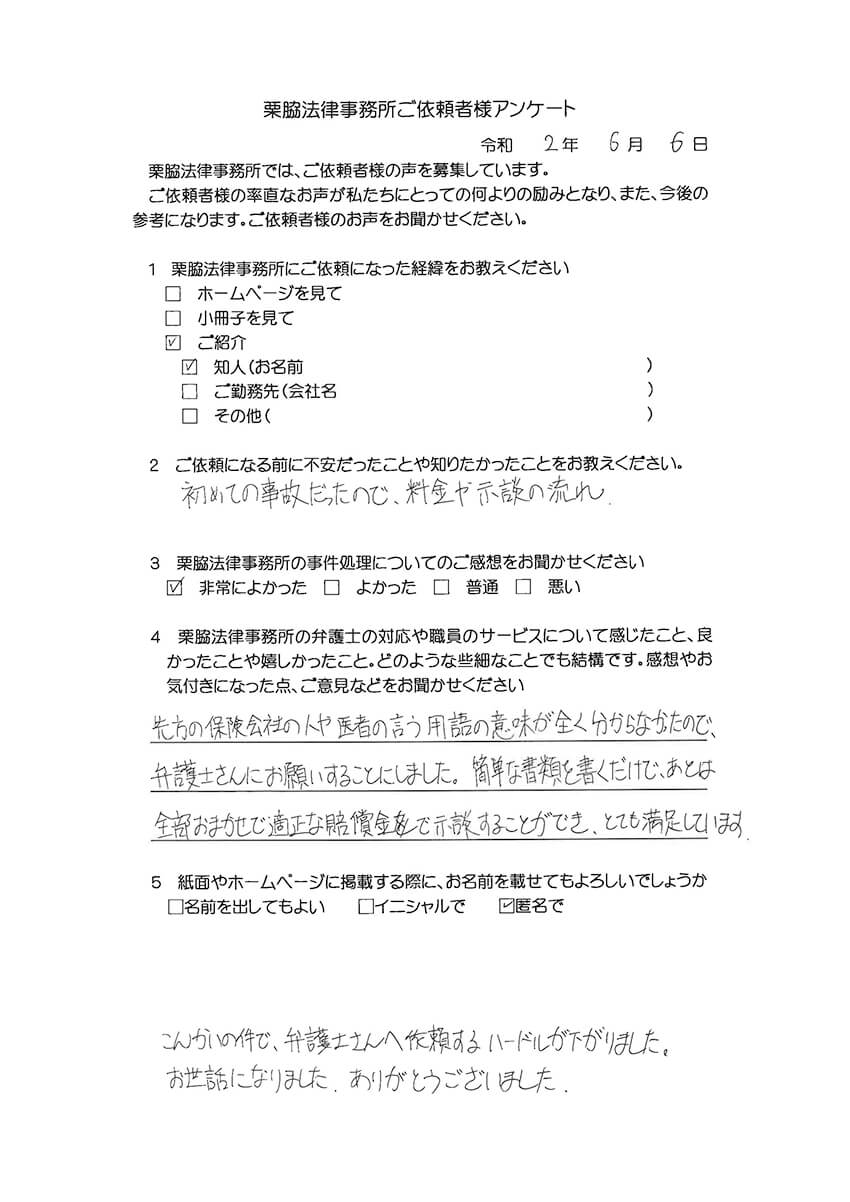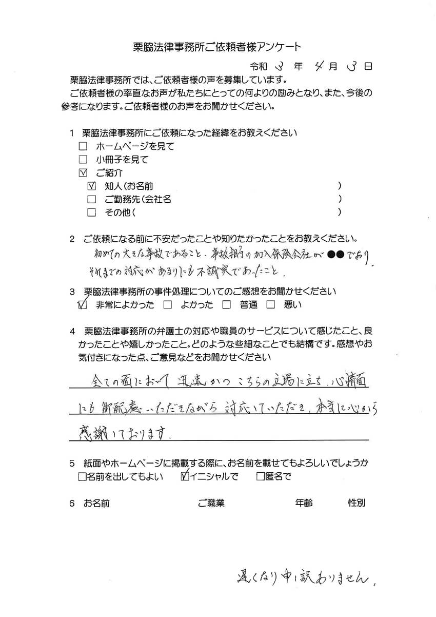 事故直後から頭が働かない中、次々に保険会社から送られてくる書類の山を処理してくださり、的確なアドバイスや1年にわたる交渉を進めてくださり感謝しています。何より、心身共に傷ついていたところ、治療に専念できたことが有難かったです。