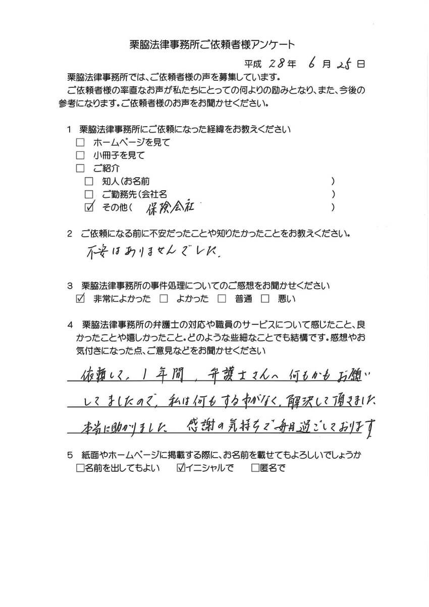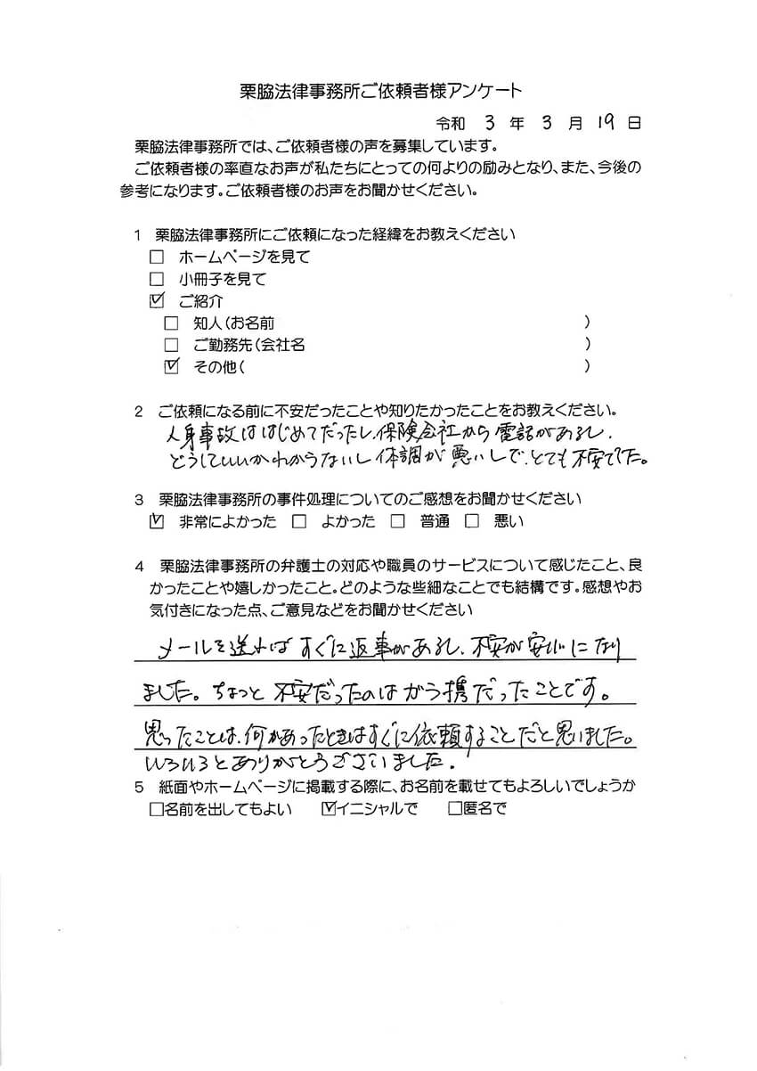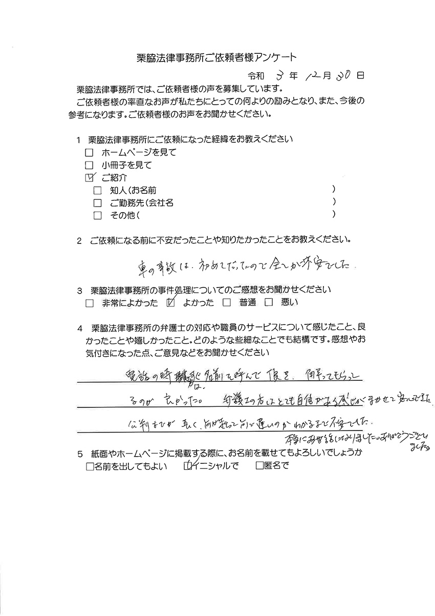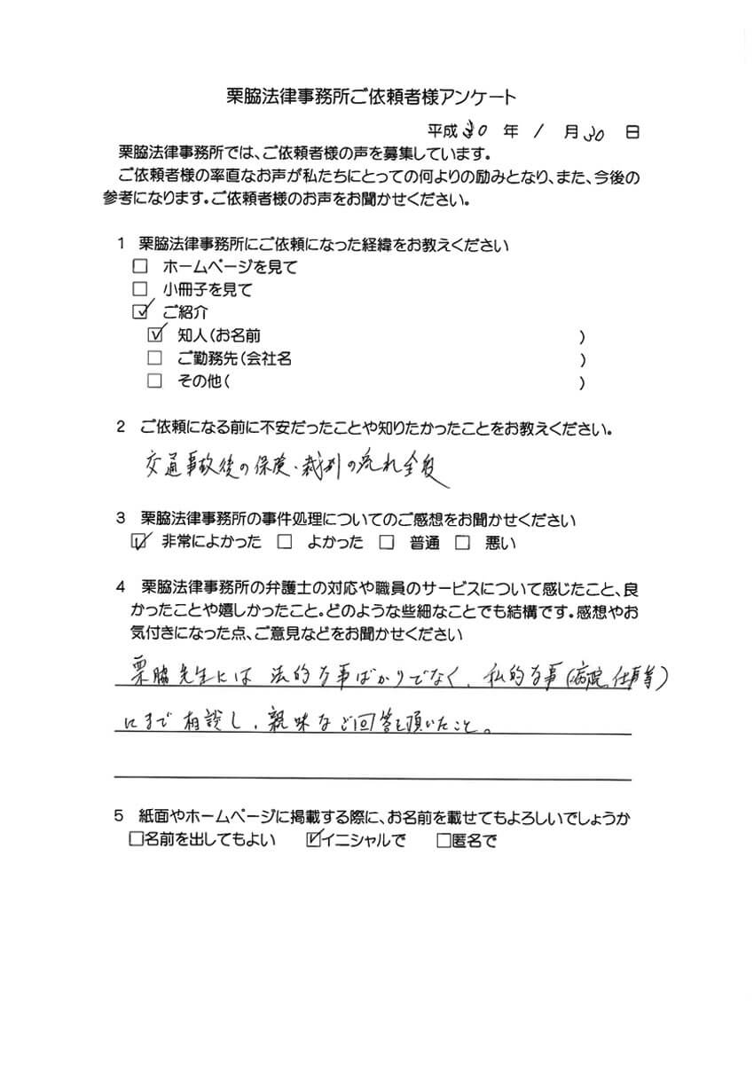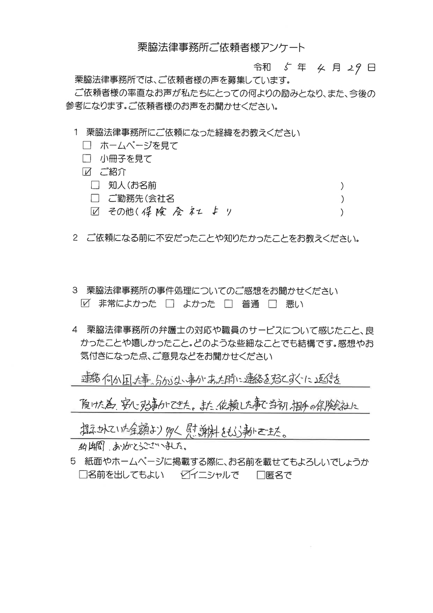 事故直後から頭が働かない中、次々に保険会社から送られてくる書類の山を処理してくださり、的確なアドバイスや1年にわたる交渉を進めてくださり感謝しています。何より、心身共に傷ついていたところ、治療に専念できたことが有難かったです。