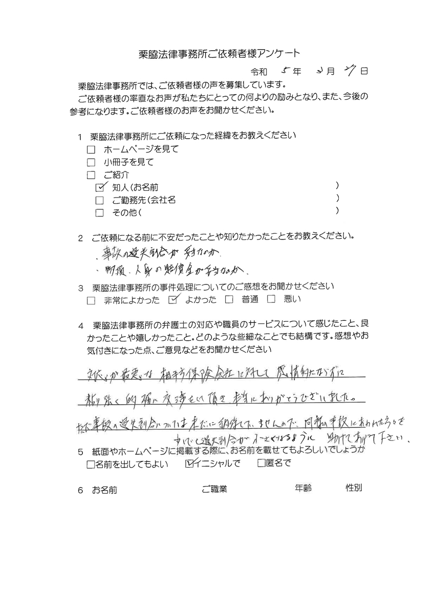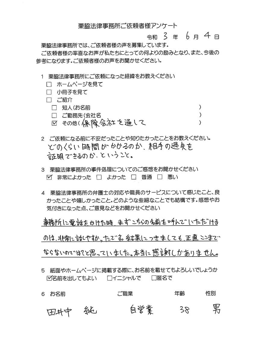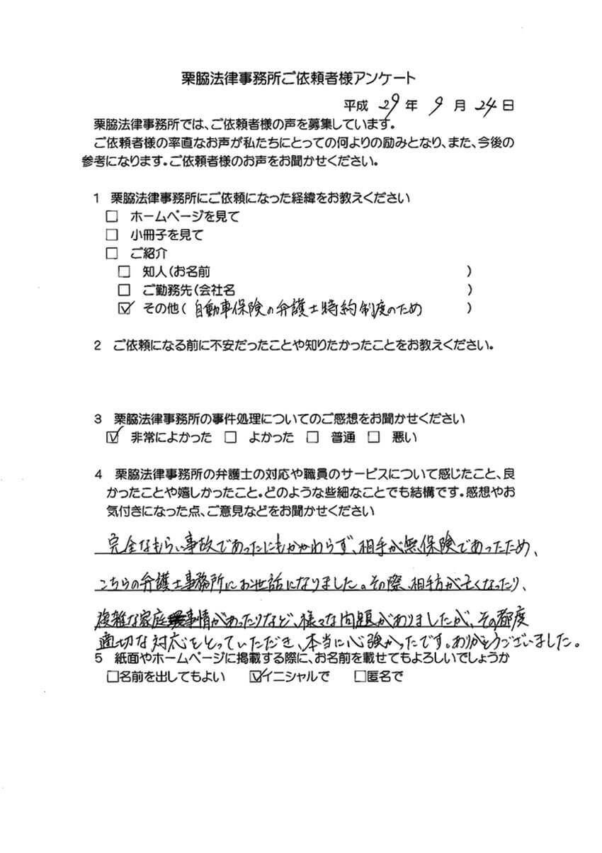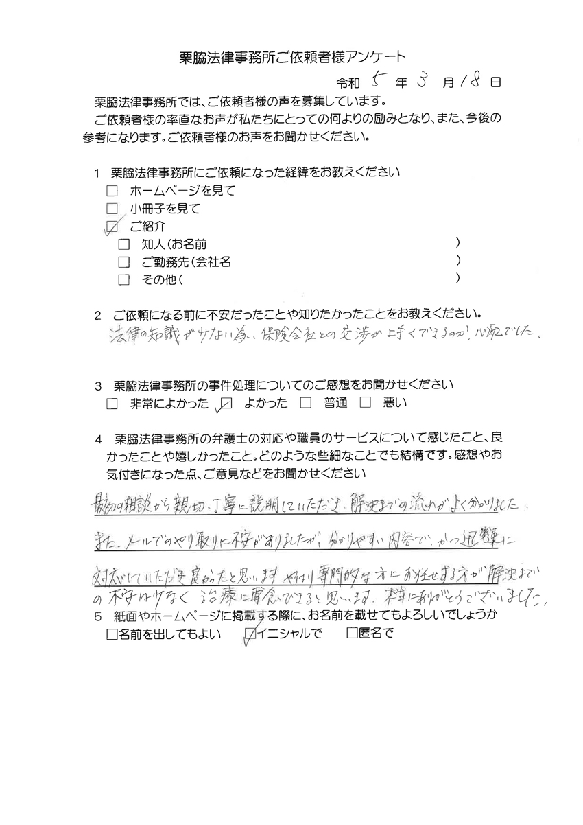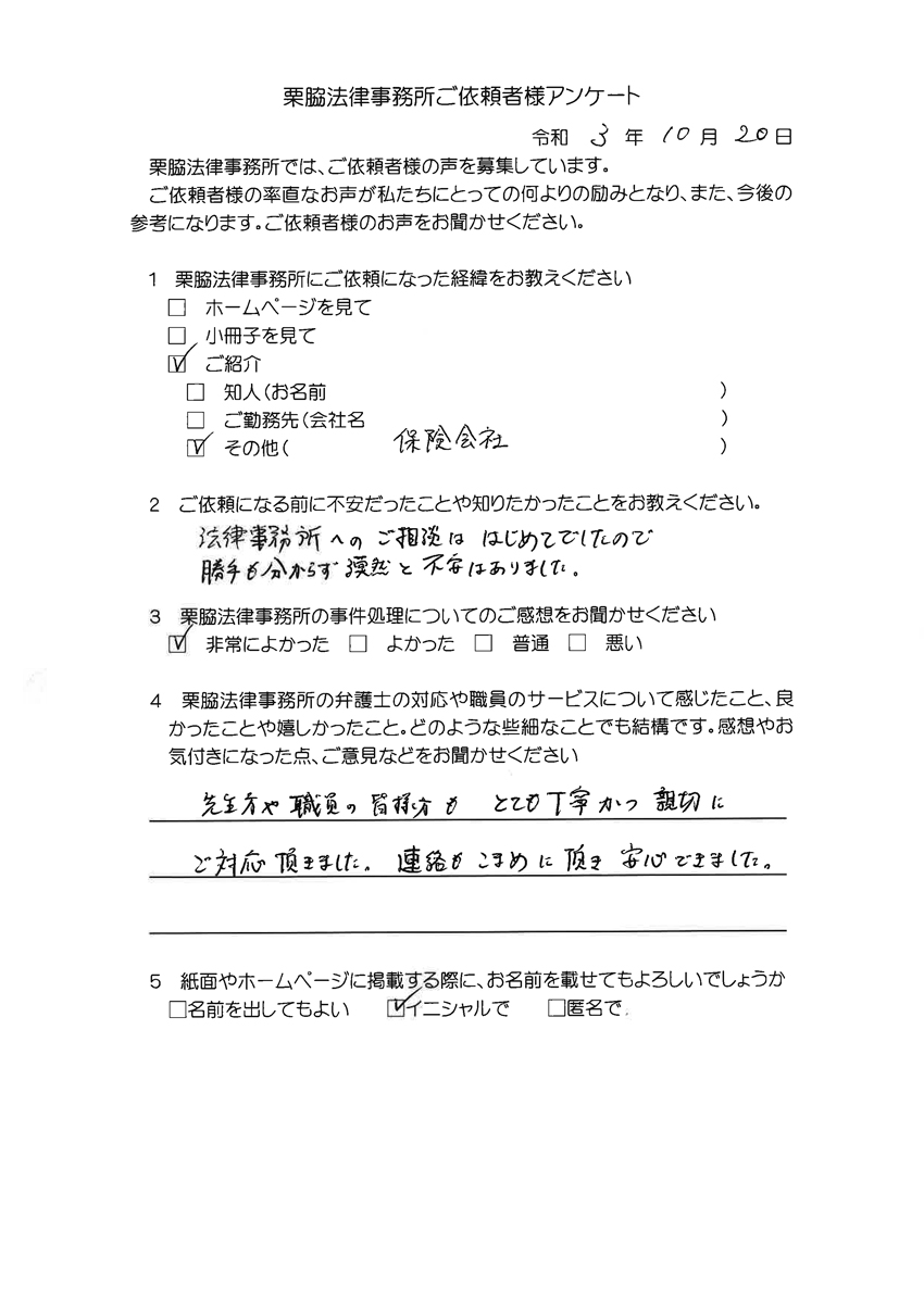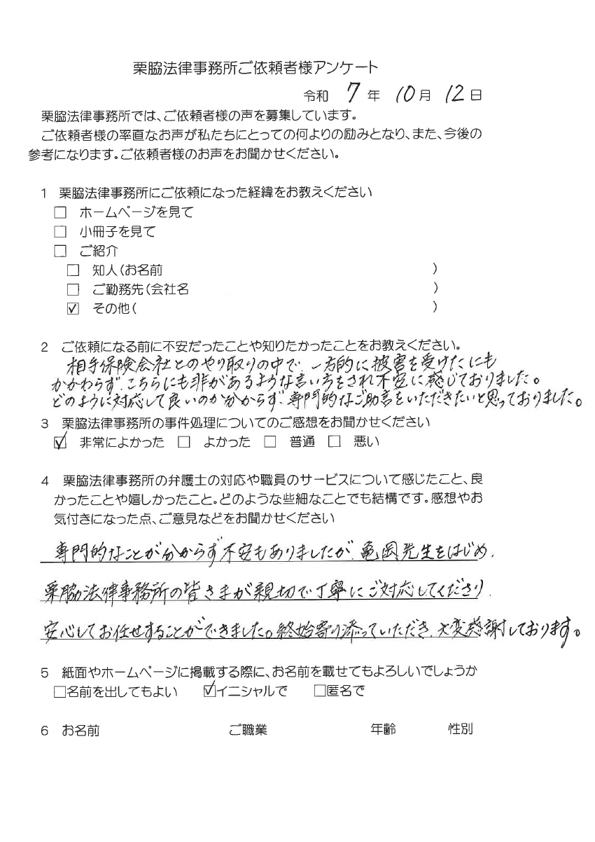 事故直後から頭が働かない中、次々に保険会社から送られてくる書類の山を処理してくださり、的確なアドバイスや1年にわたる交渉を進めてくださり感謝しています。何より、心身共に傷ついていたところ、治療に専念できたことが有難かったです。
