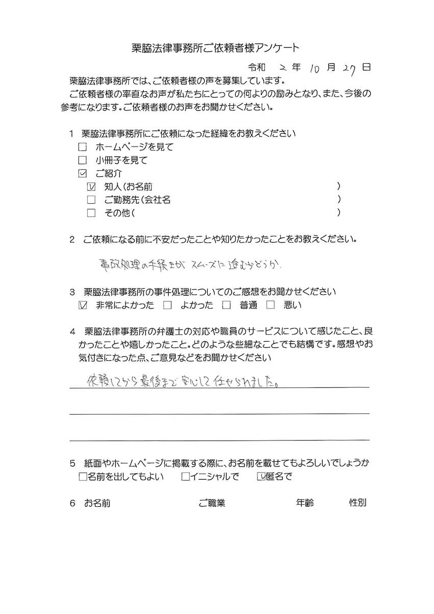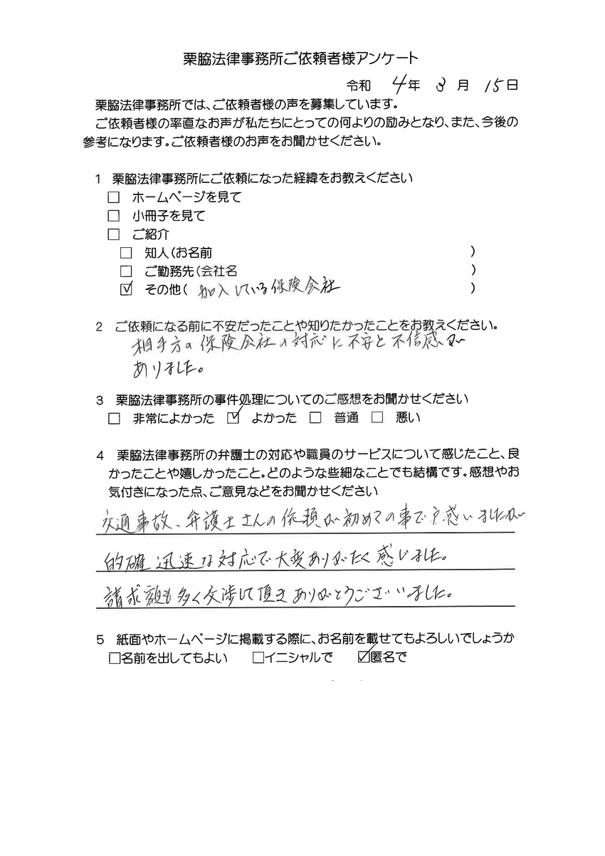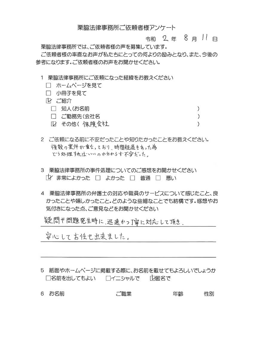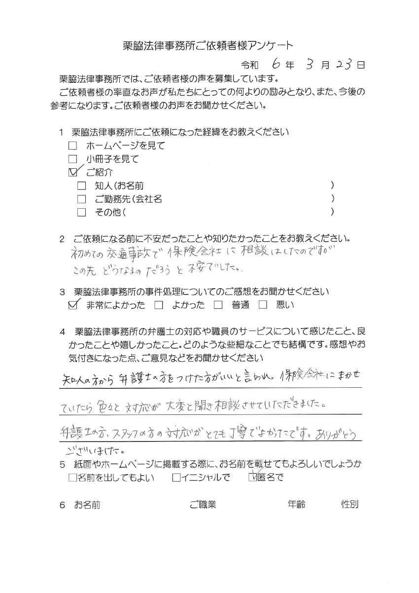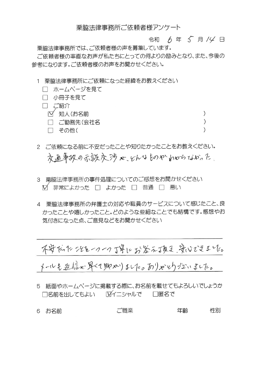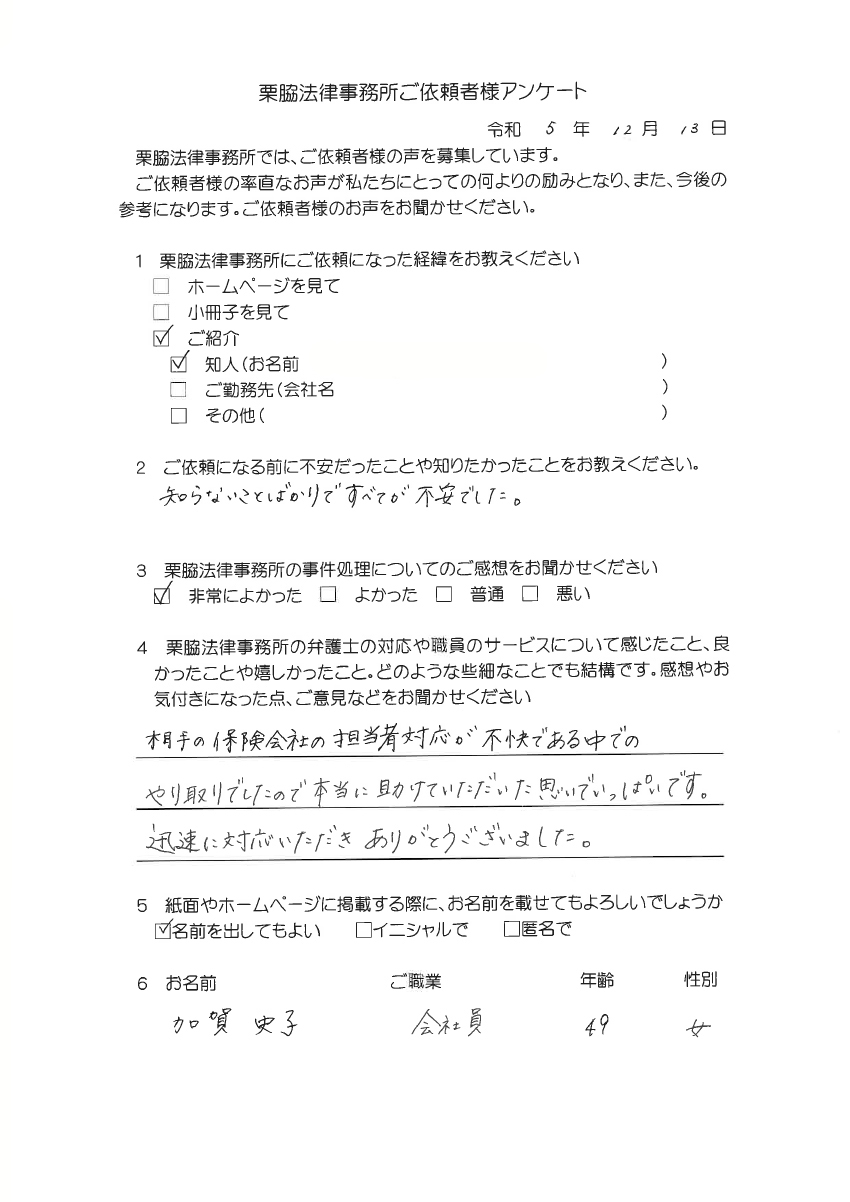 事故直後から頭が働かない中、次々に保険会社から送られてくる書類の山を処理してくださり、的確なアドバイスや1年にわたる交渉を進めてくださり感謝しています。何より、心身共に傷ついていたところ、治療に専念できたことが有難かったです。