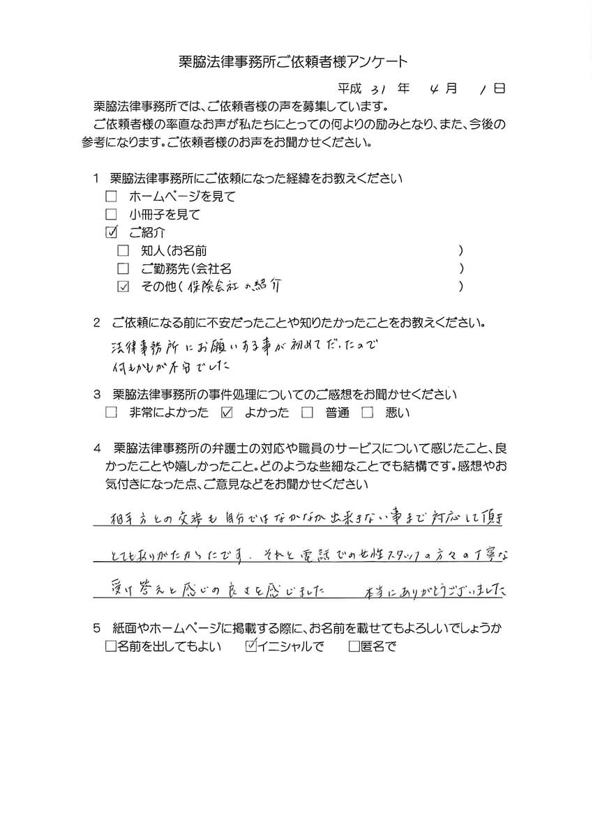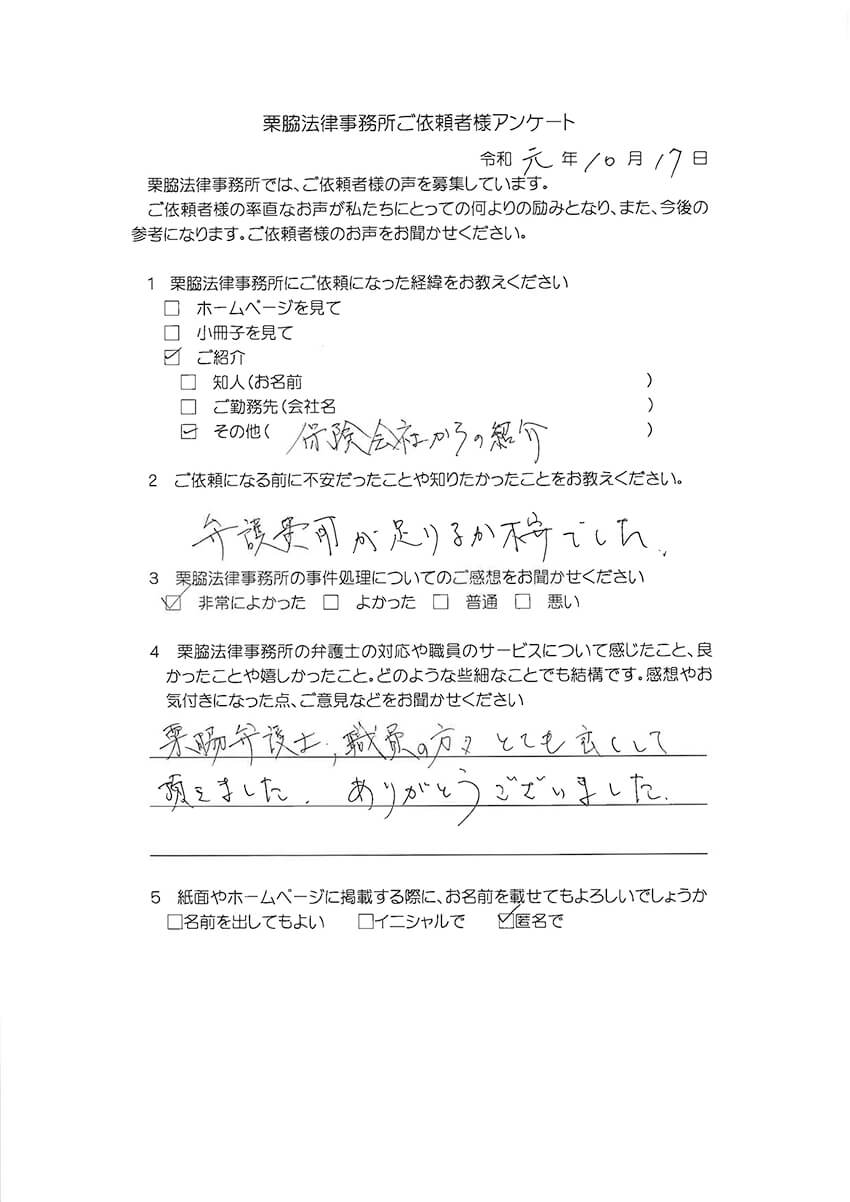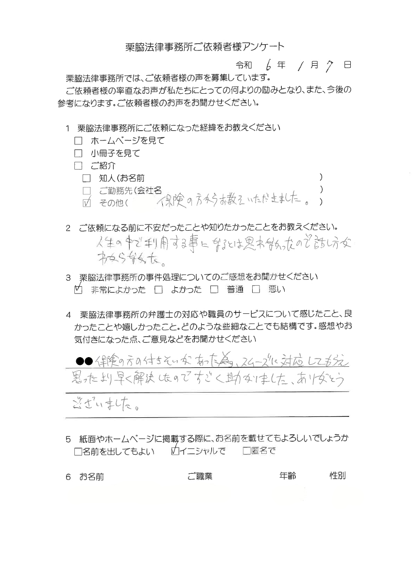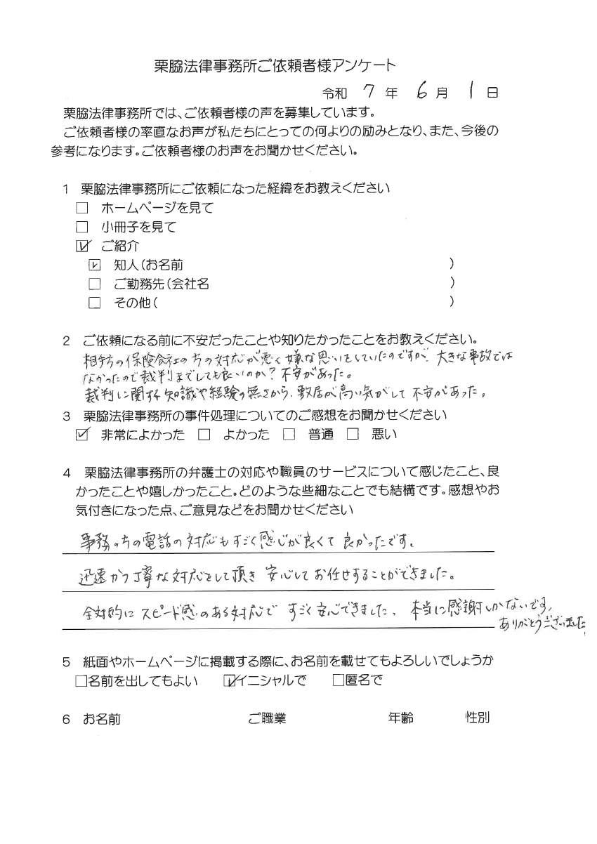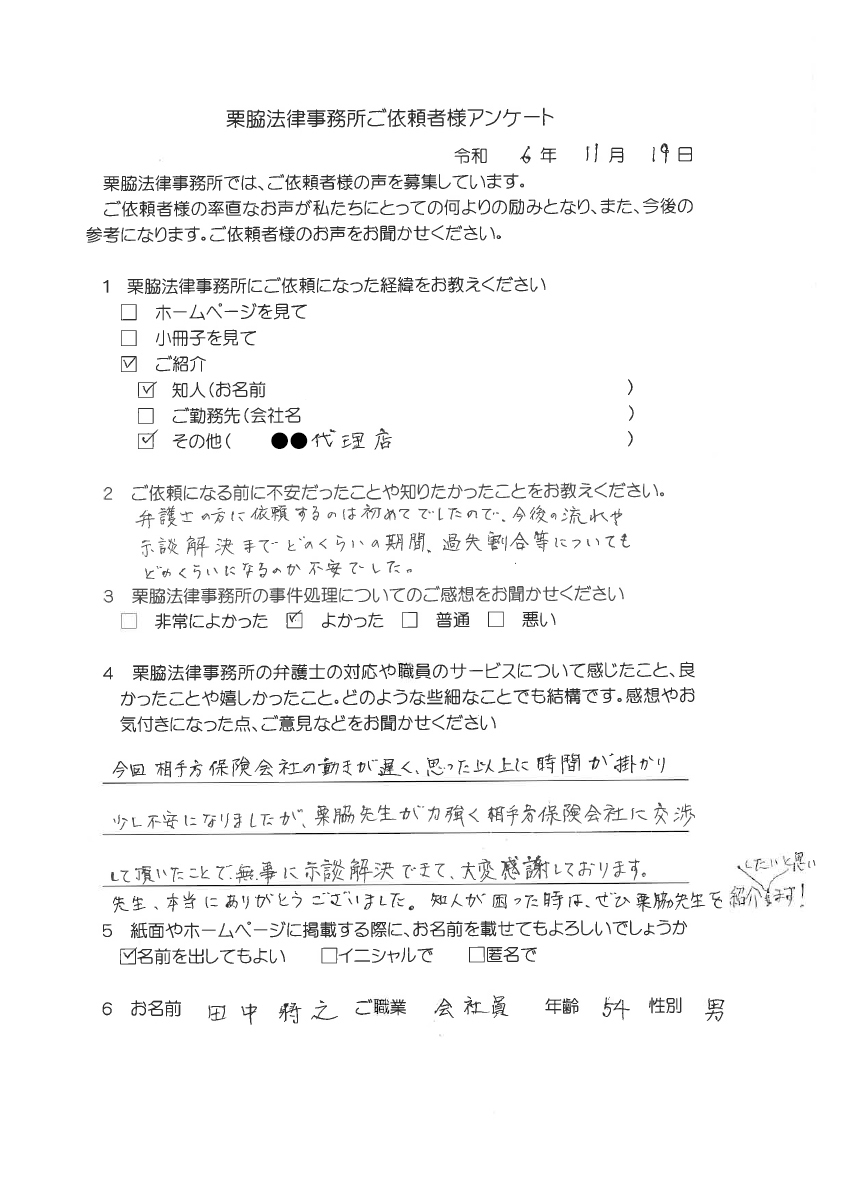 事故直後から頭が働かない中、次々に保険会社から送られてくる書類の山を処理してくださり、的確なアドバイスや1年にわたる交渉を進めてくださり感謝しています。何より、心身共に傷ついていたところ、治療に専念できたことが有難かったです。