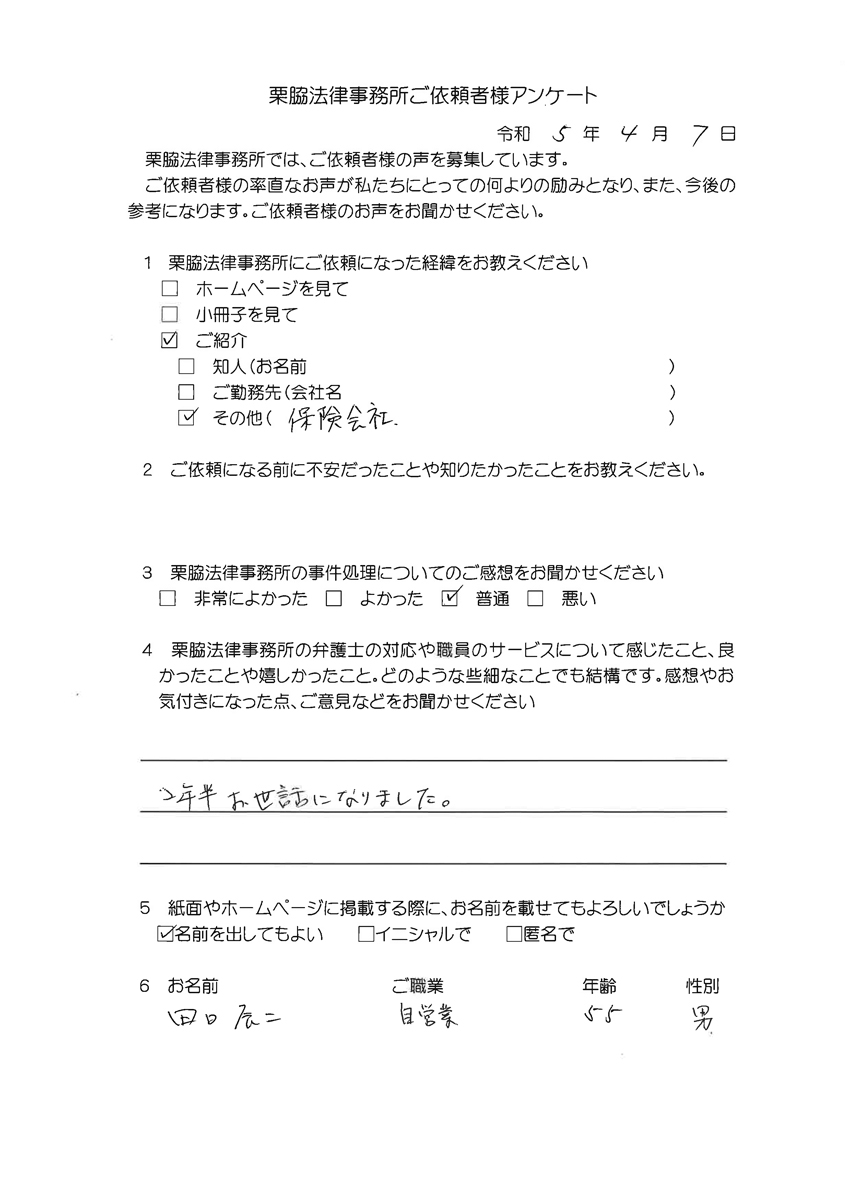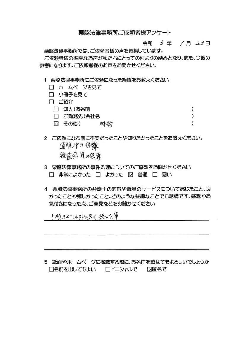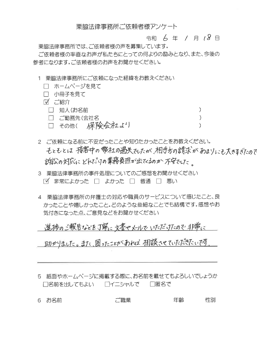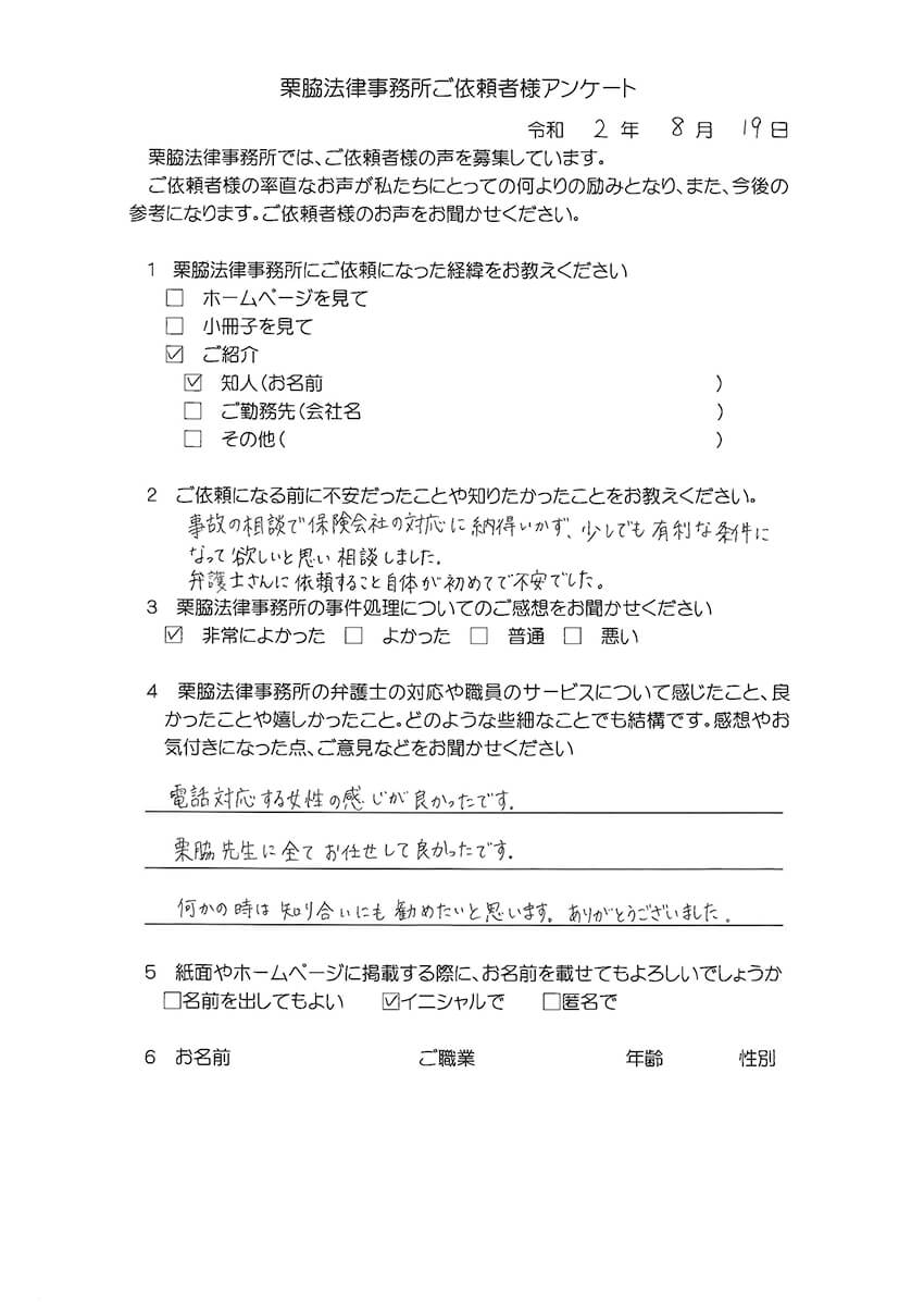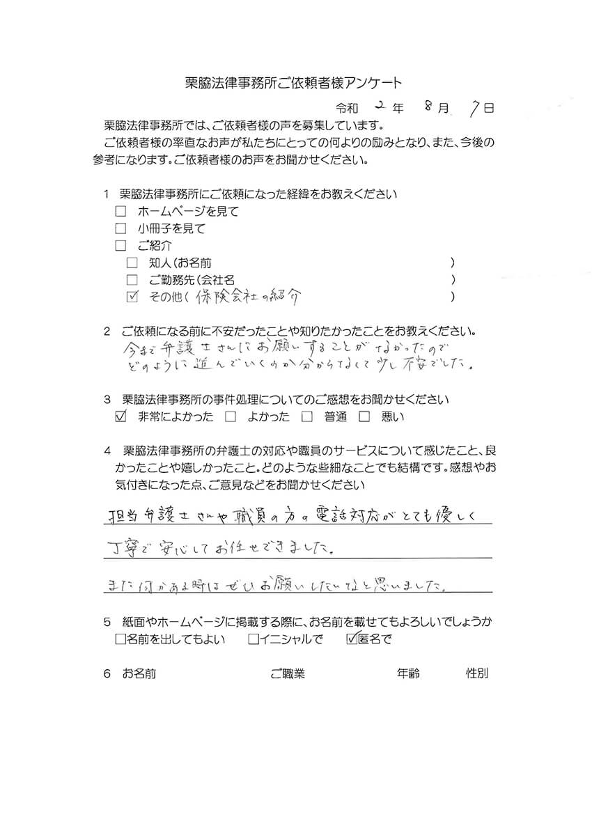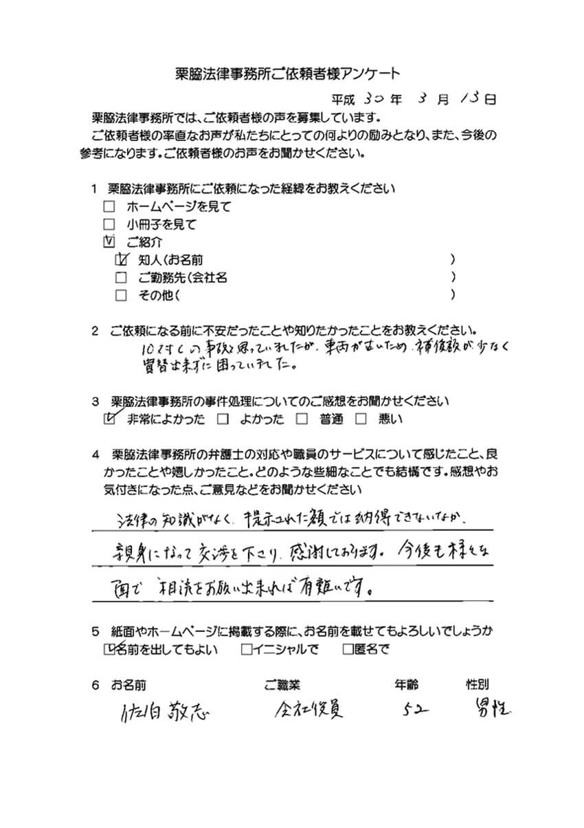 事故直後から頭が働かない中、次々に保険会社から送られてくる書類の山を処理してくださり、的確なアドバイスや1年にわたる交渉を進めてくださり感謝しています。何より、心身共に傷ついていたところ、治療に専念できたことが有難かったです。