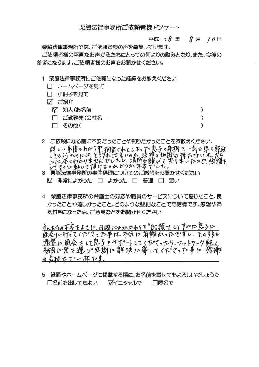 私たちの不安をよそに、日曜にもかかわらず依頼をしてすぐに息子に面会に行ってくださった事は本当に有難かったですし、その後も頻繁に面会をして息子をサポートしてくださったり、フットワーク軽く多方面に足を運び早期に解決に導いてくださった事に感謝の気持ちで一杯です。