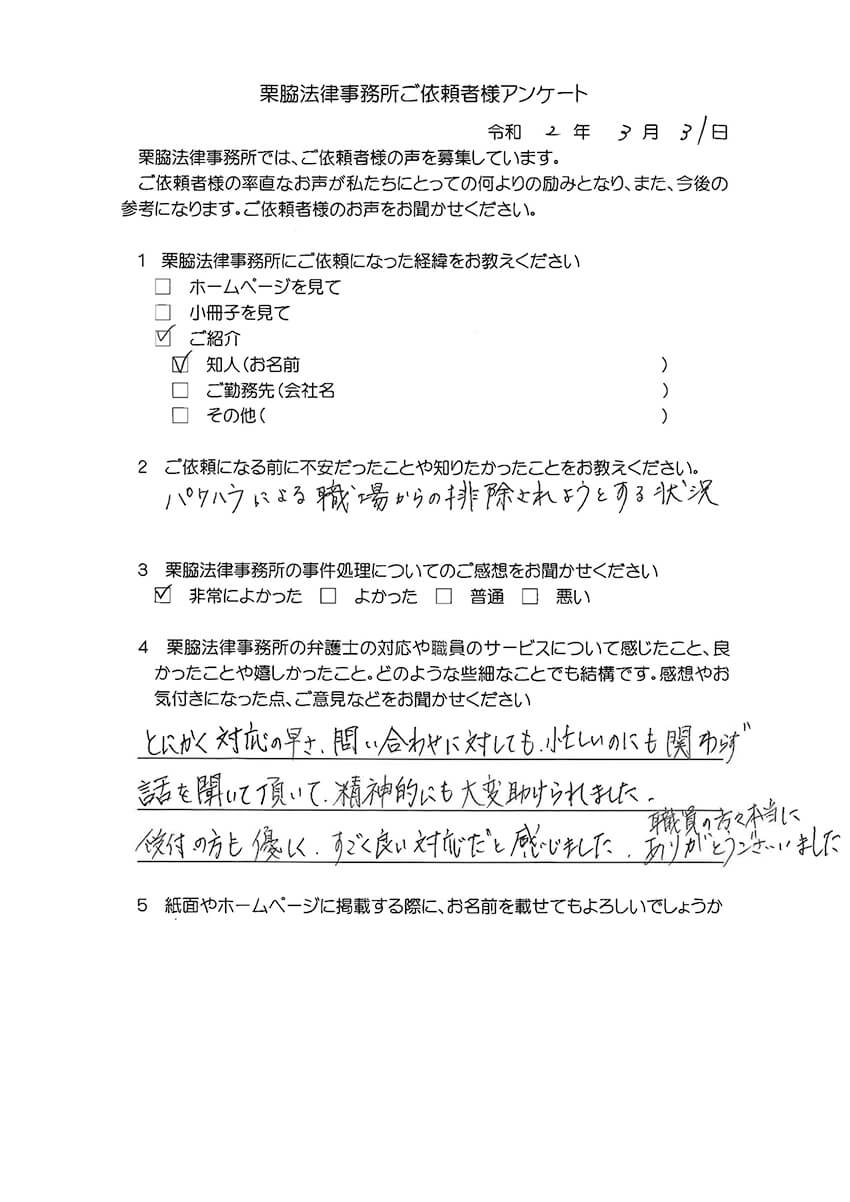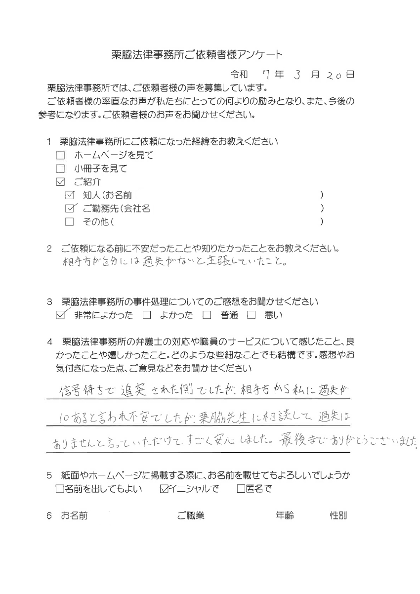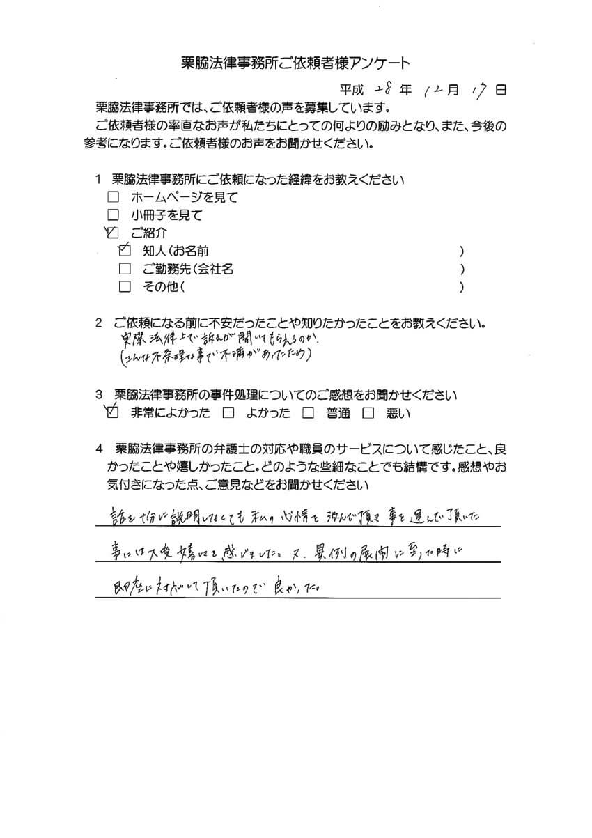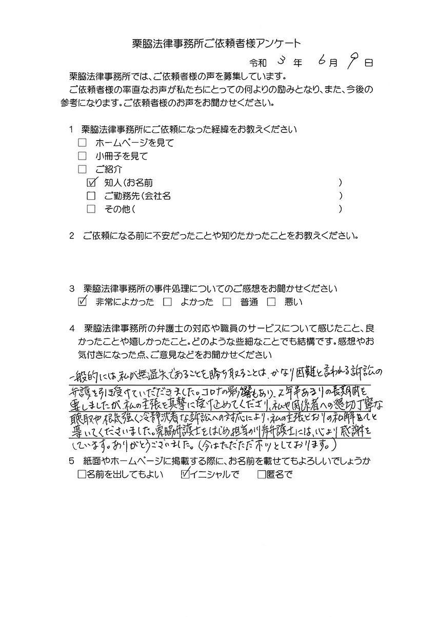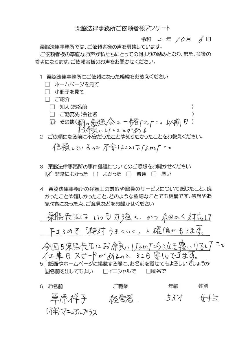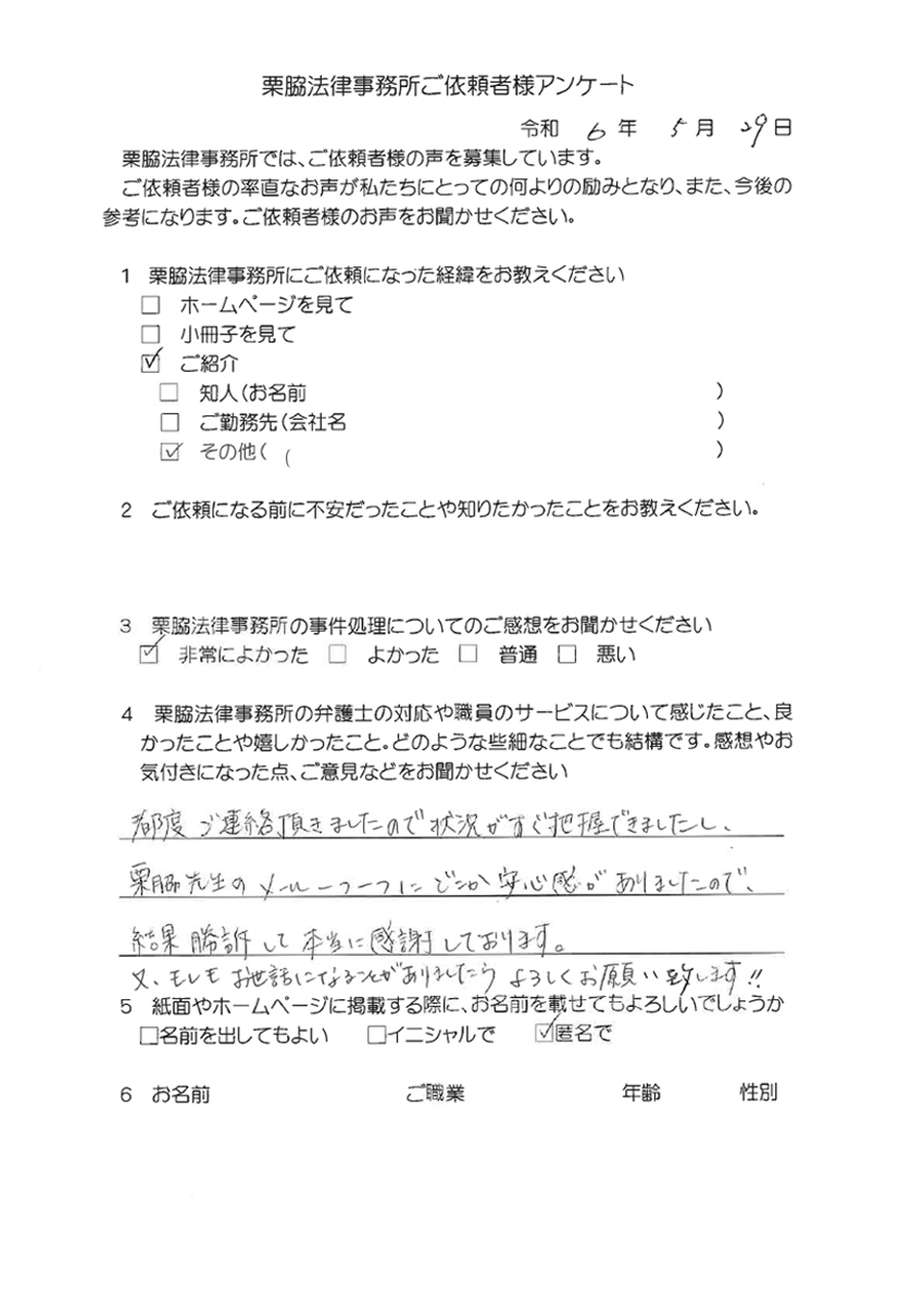 裁判報告を受けるにつけ、相手方の言い分や主張、最後は論点まで変わってきていて、恐ろしさまで覚えました。そのようなときの栗脇法律事務所様の先生方の対応が冷静沈着で、そこではじめて「栗脇法律事務所」に担当していただき、良かったと心から思いました。私が感じていた「恐ろしさ」に対する分析、反論に“敏腕”弁護士さんだと安心感しかありませんでした。違う弁護士さんだったら、このように収まらなかったかもしれません。今は感謝しかありません。本当にありがとうございました。