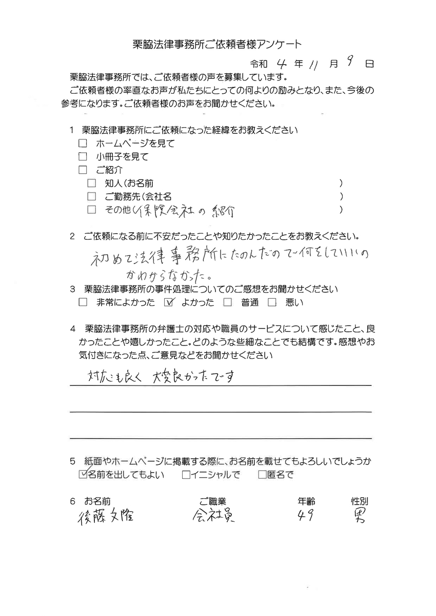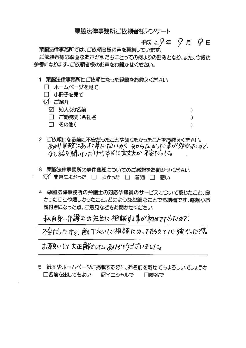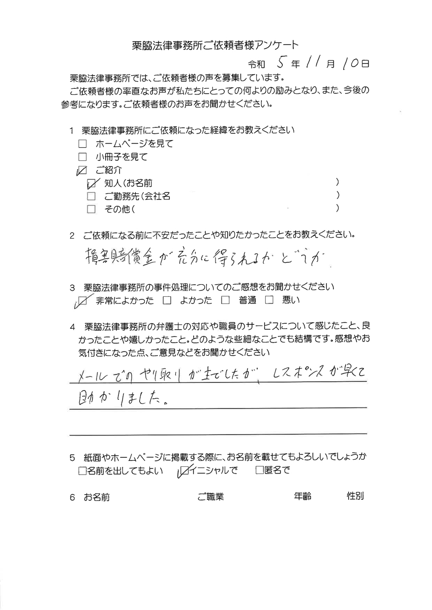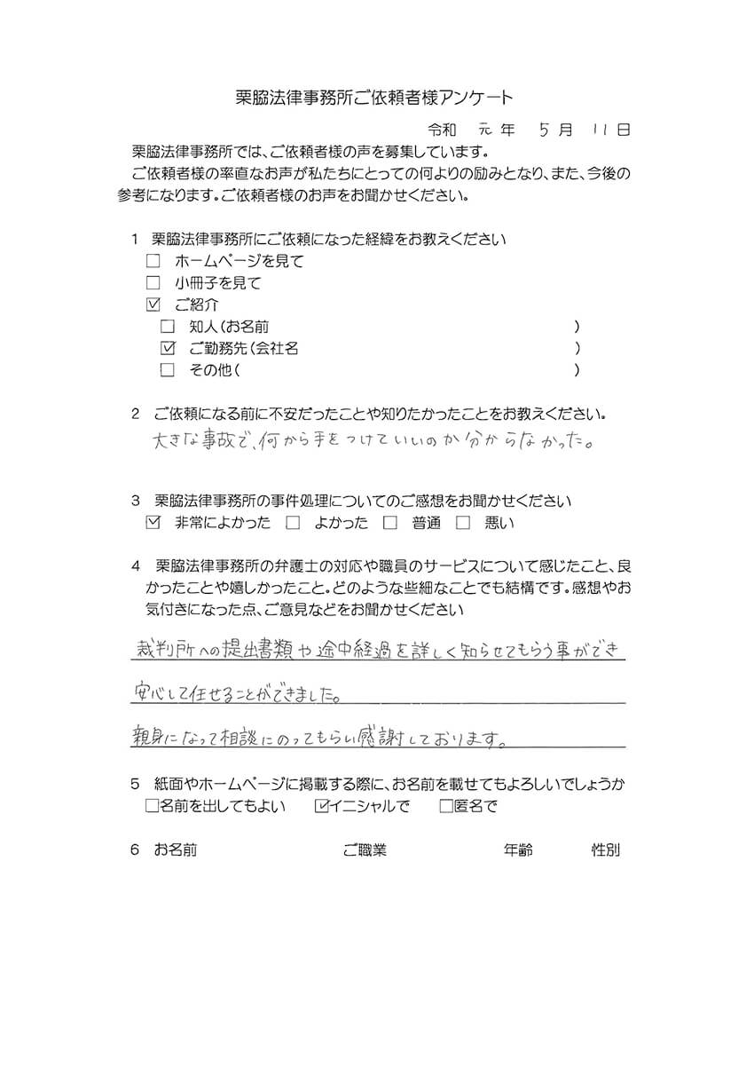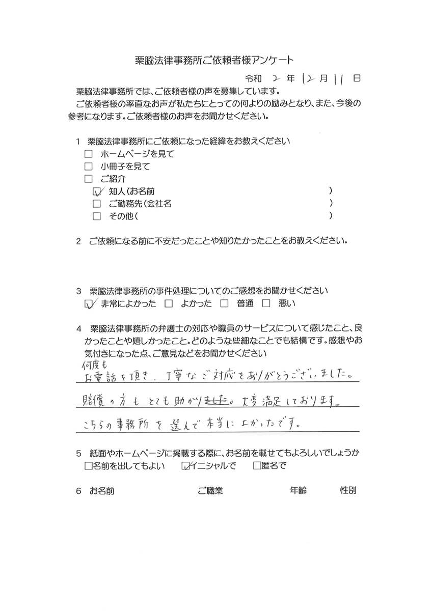 書類の揃え方等、いろいろと教えていただきありがとうございました。また、電話した折に当方の名前を登録して下さって対応していただいた事がうれしかったです。賠償金がすべてではありませんが、先生のお力だと感謝しております。本当にありがとうございました。