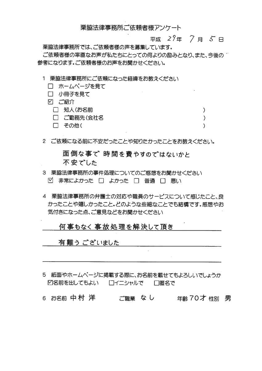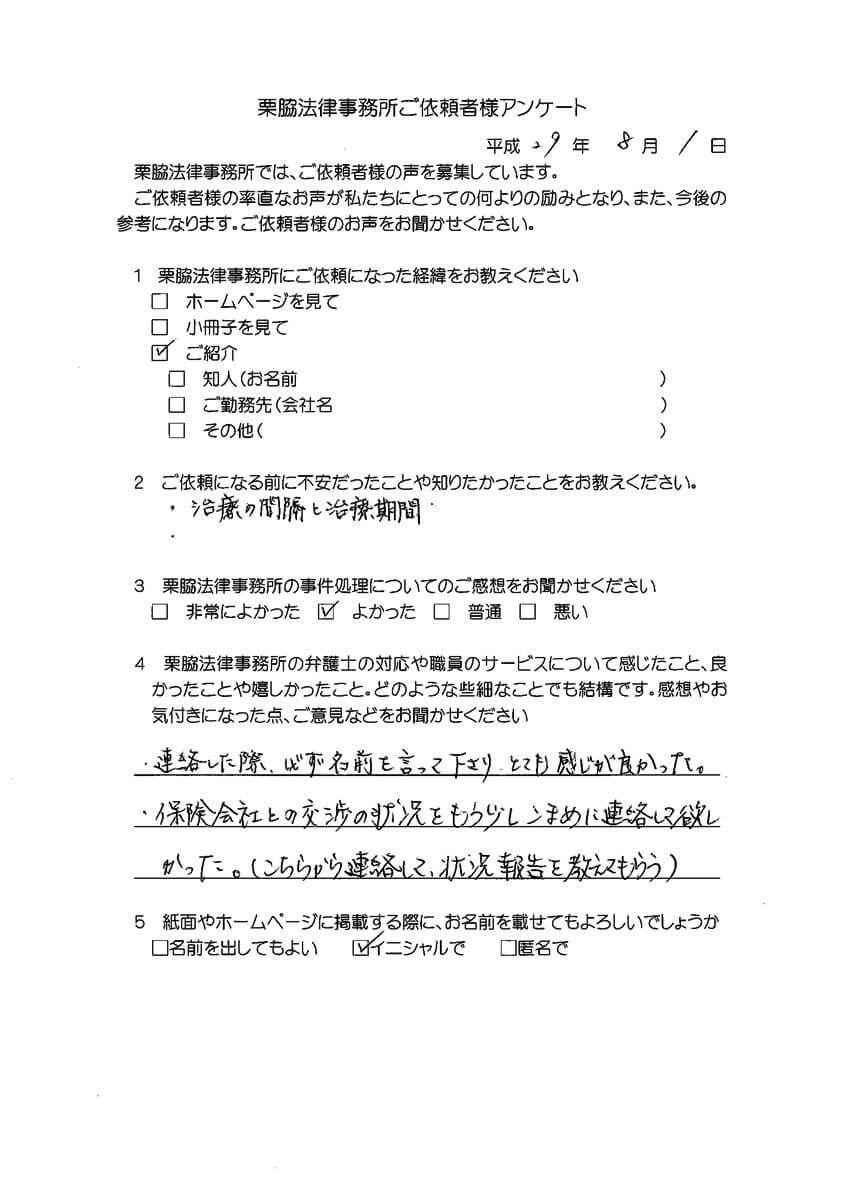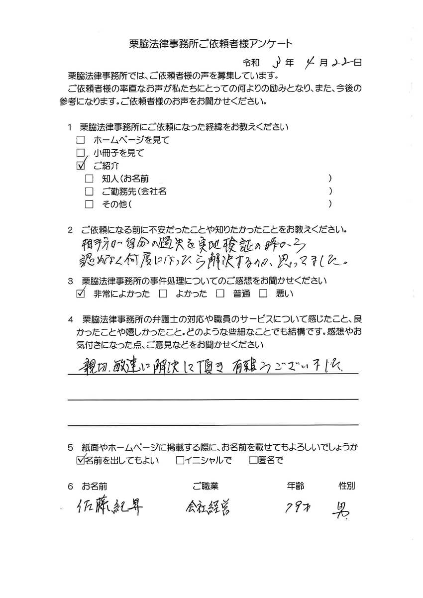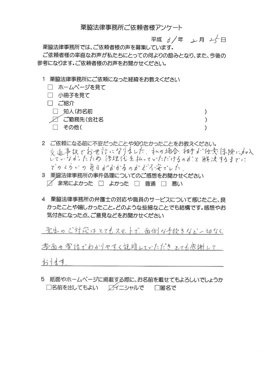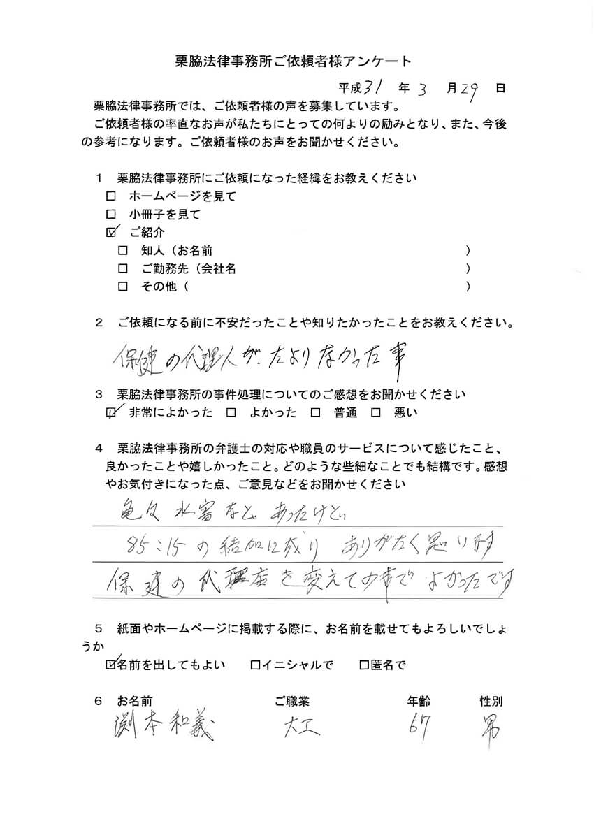 書類の揃え方等、いろいろと教えていただきありがとうございました。また、電話した折に当方の名前を登録して下さって対応していただいた事がうれしかったです。賠償金がすべてではありませんが、先生のお力だと感謝しております。本当にありがとうございました。
