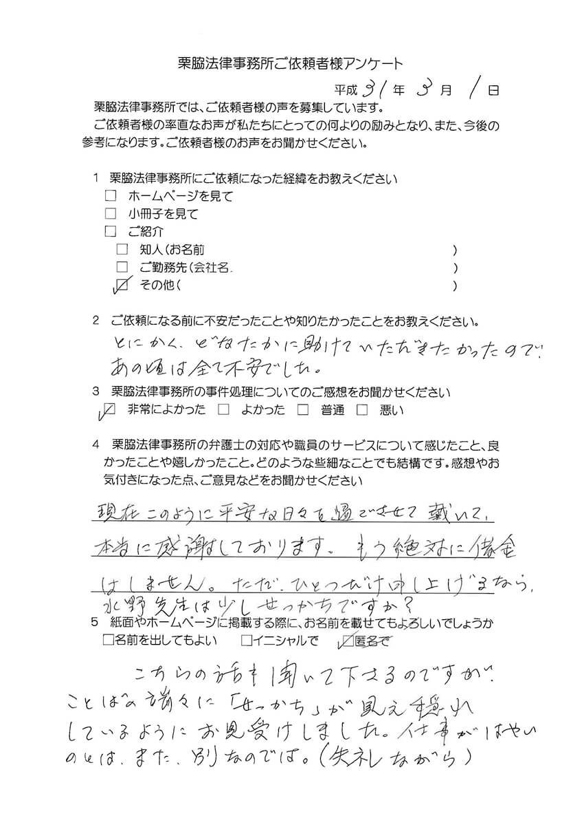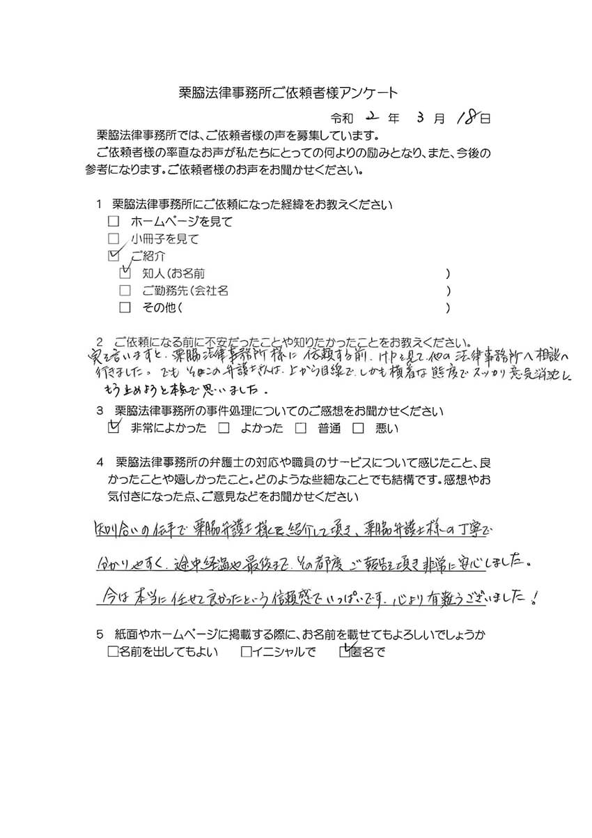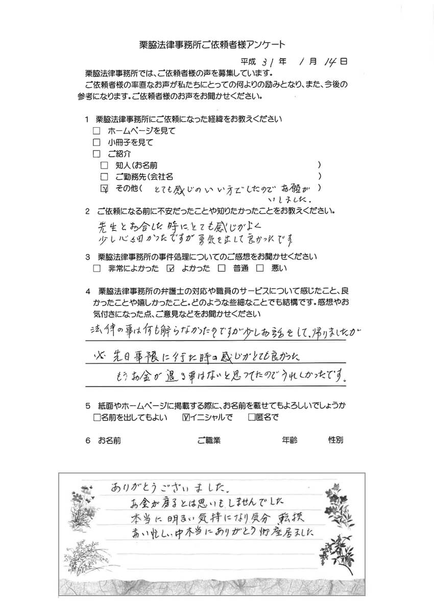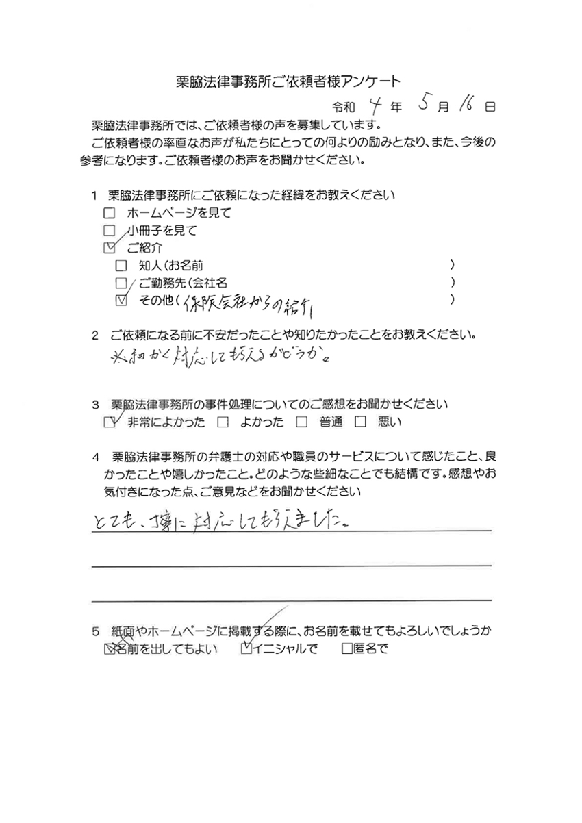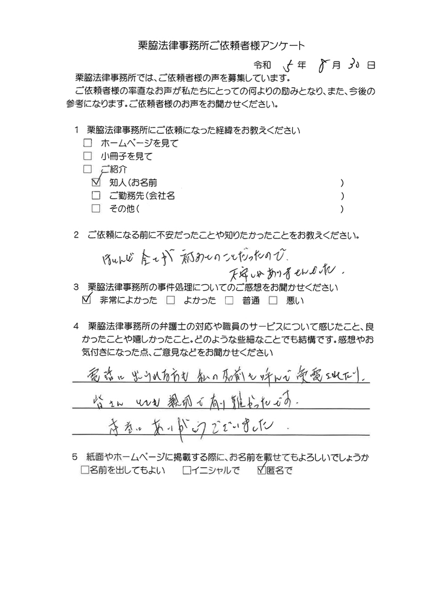 栗脇法律事務所へご依頼されたお客様から頂いた声を一部ご紹介いたします。