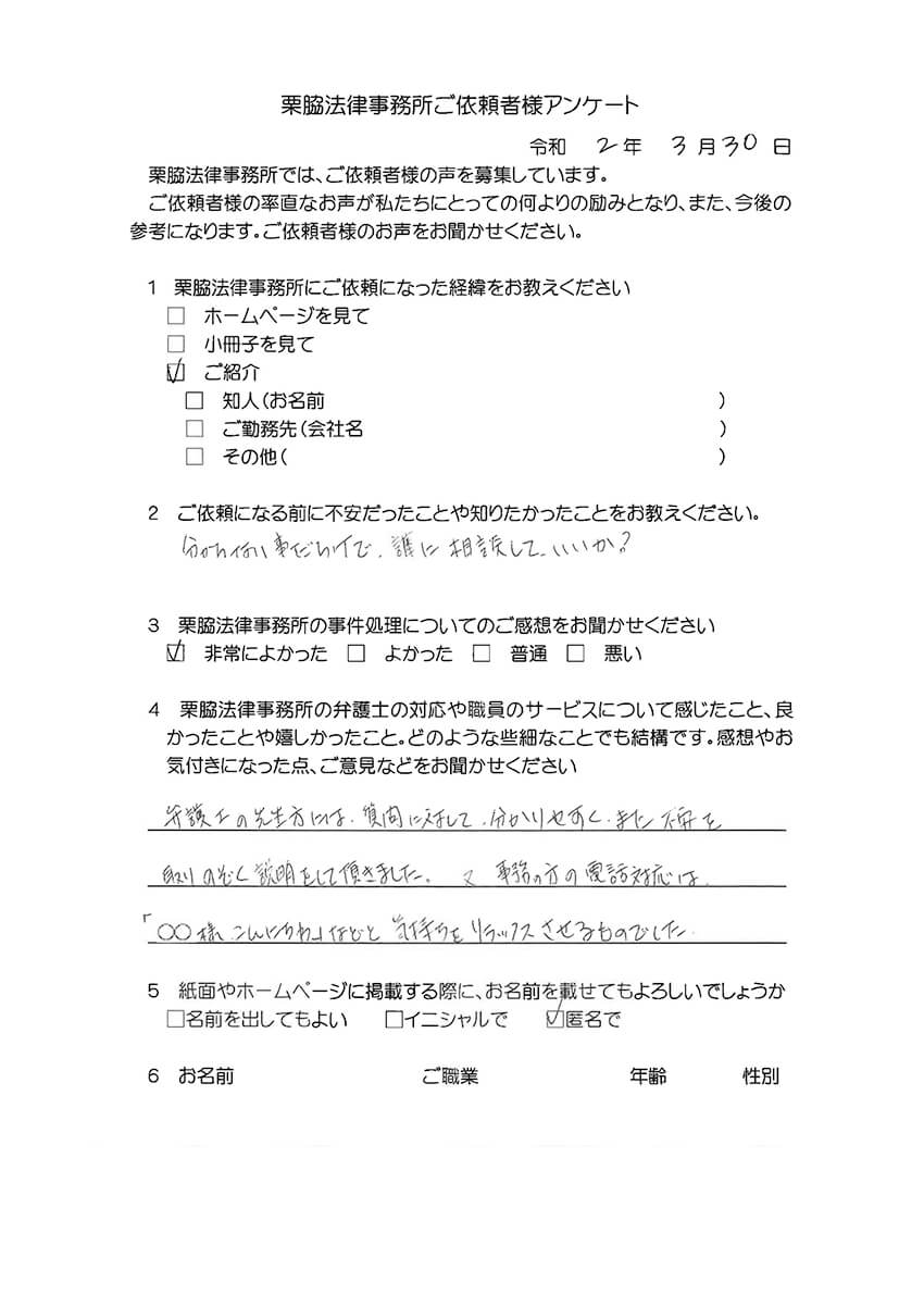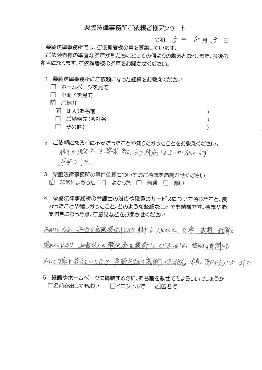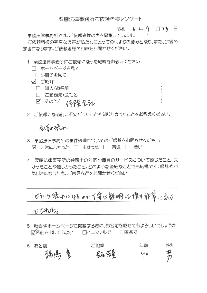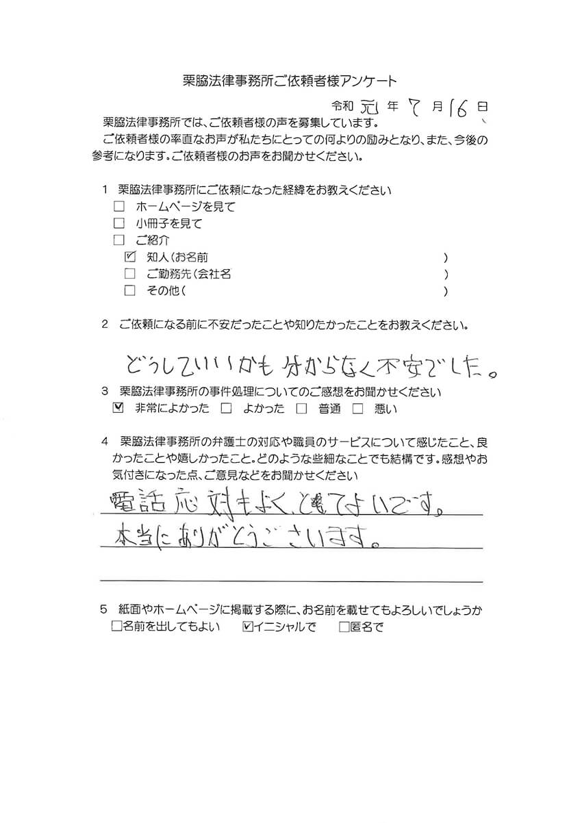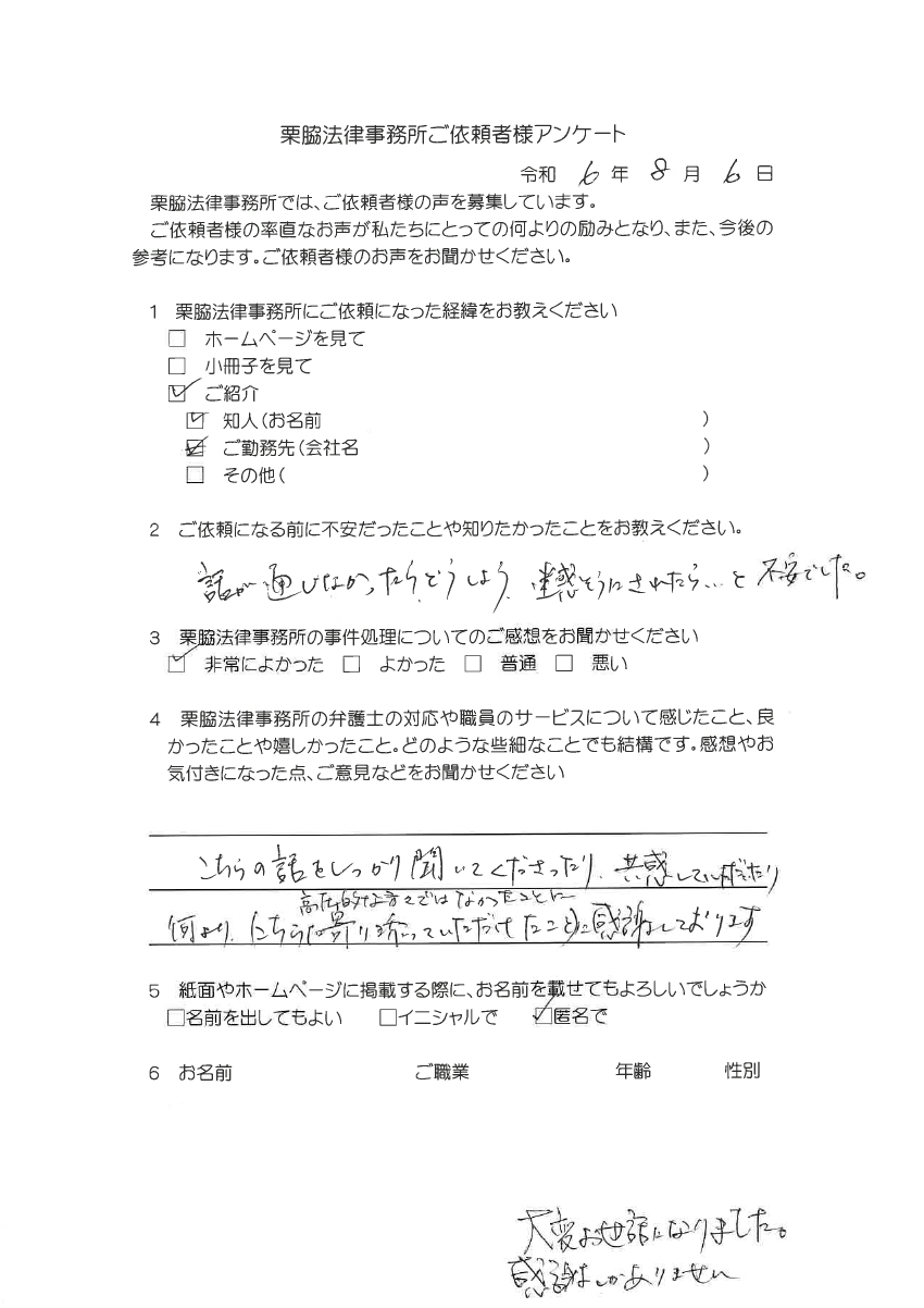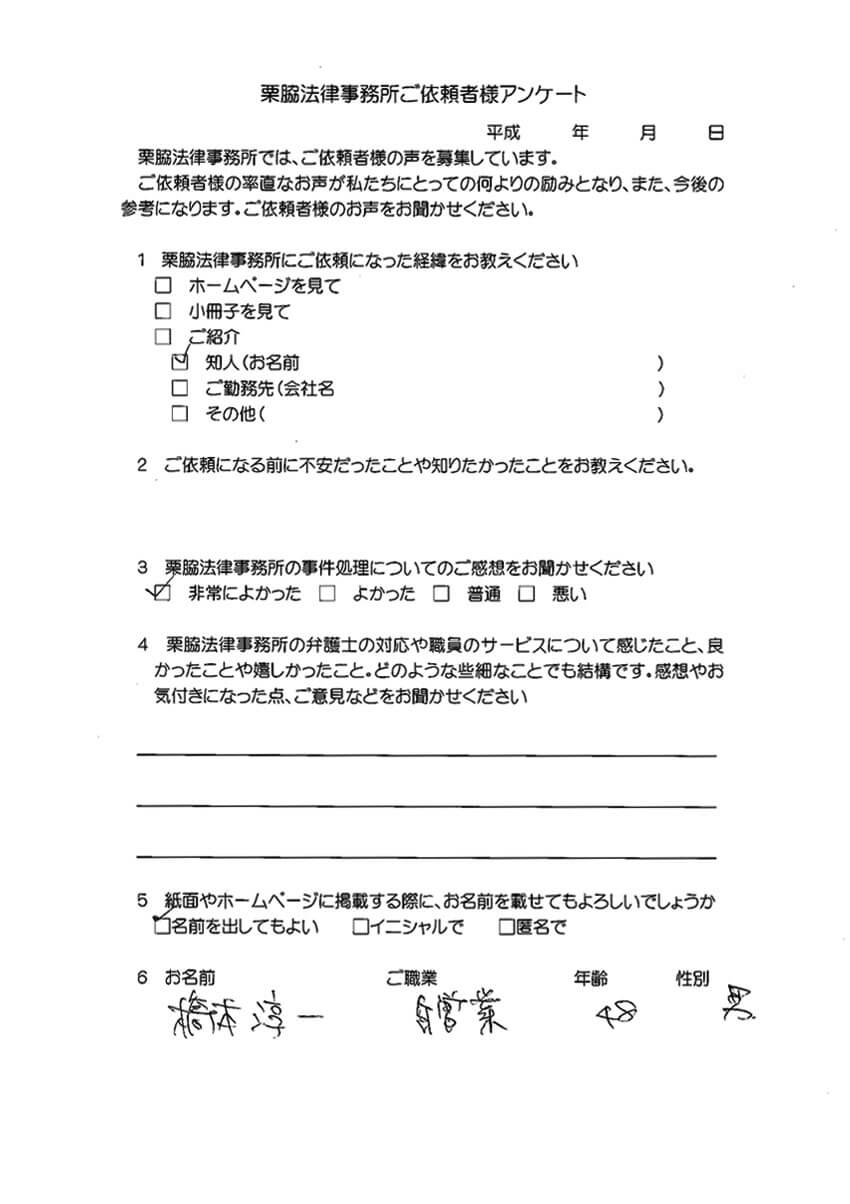 栗脇法律事務所へご依頼されたお客様から頂いた声を一部ご紹介いたします。
