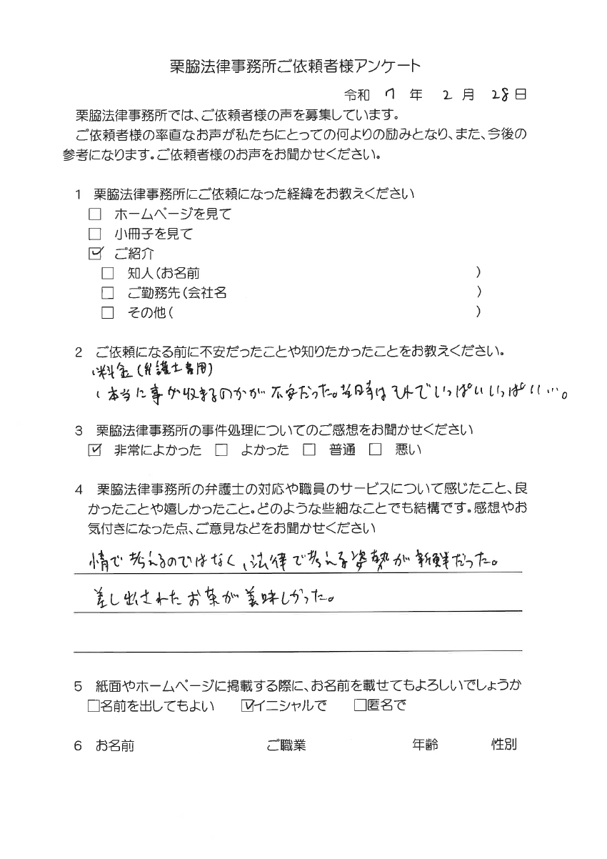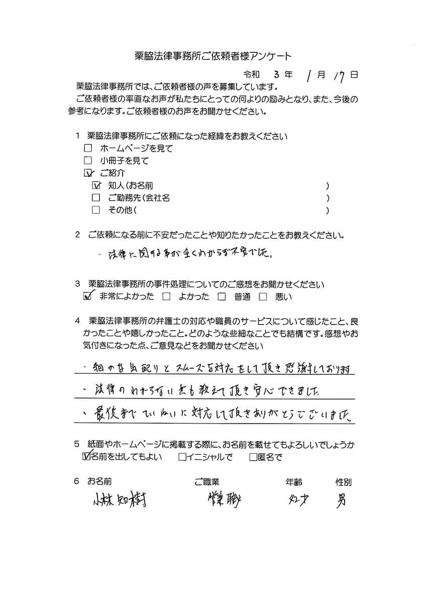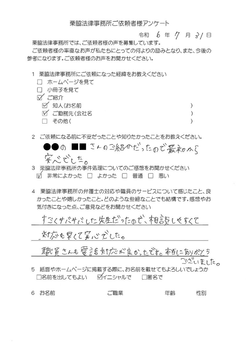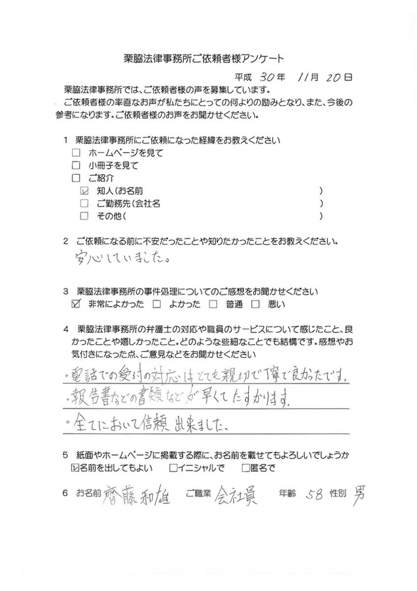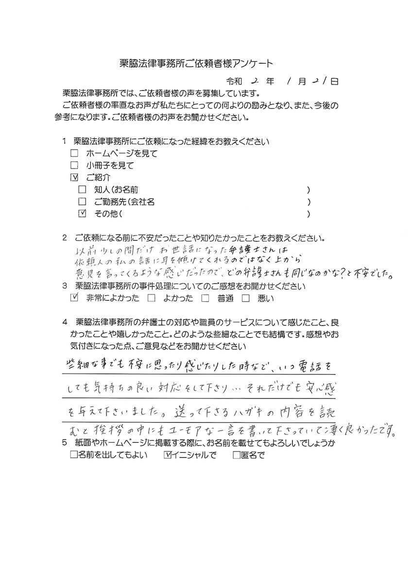 栗脇法律事務所へご依頼されたお客様から頂いた声を一部ご紹介いたします。