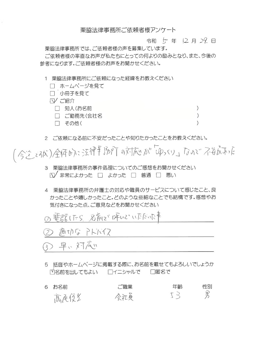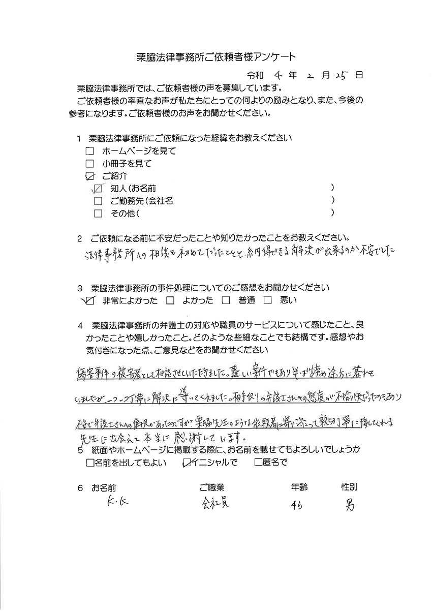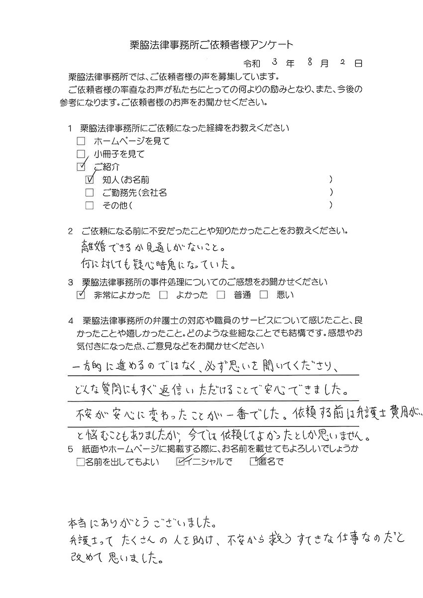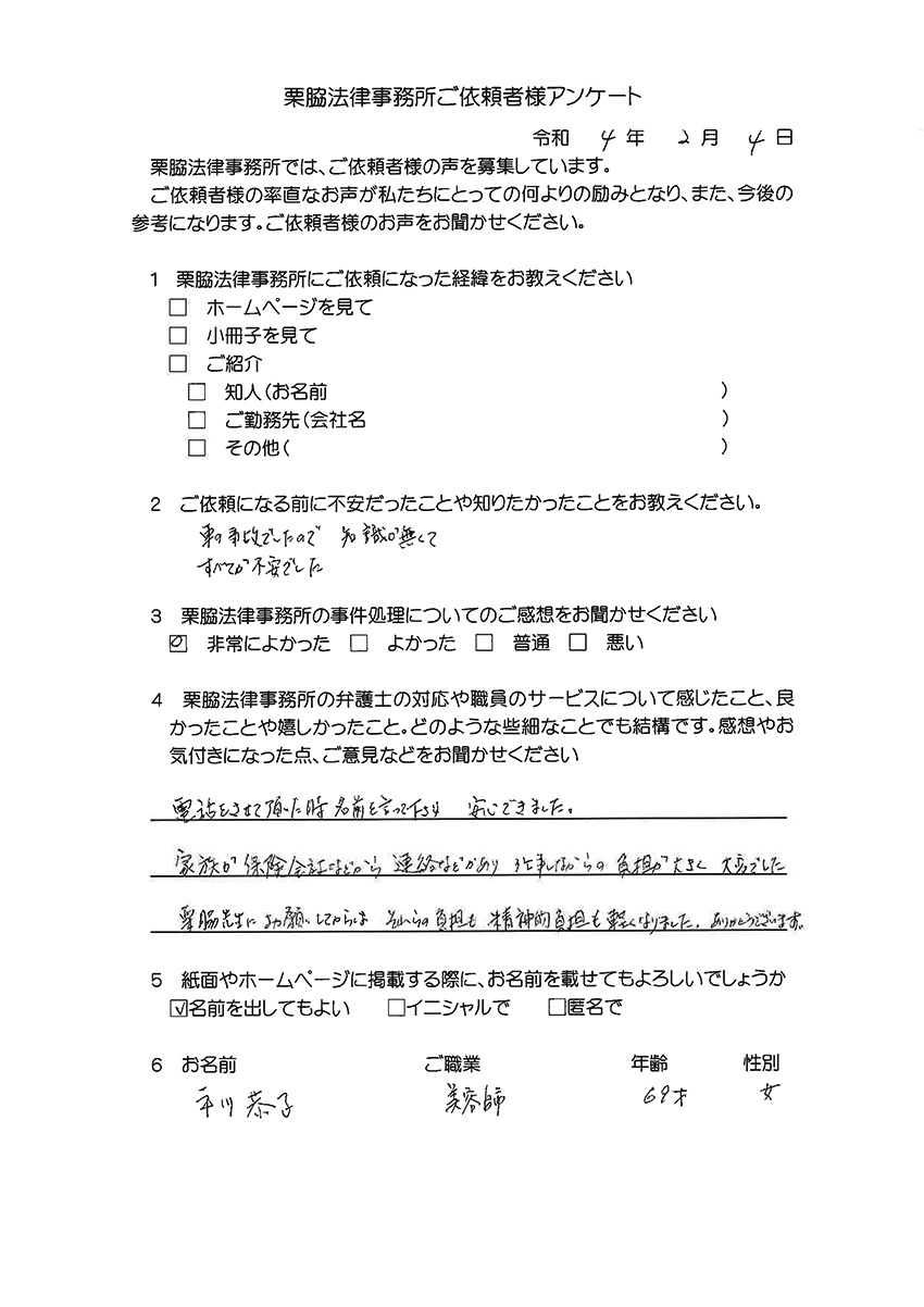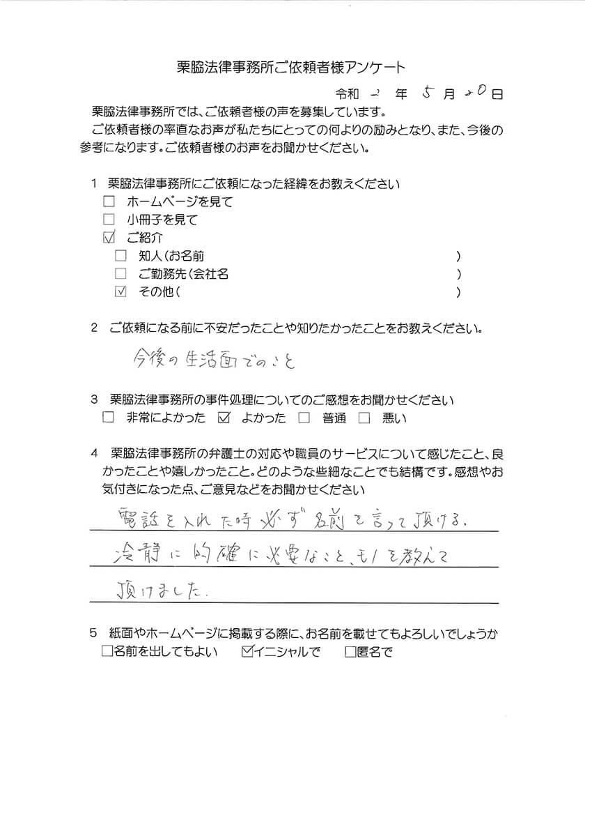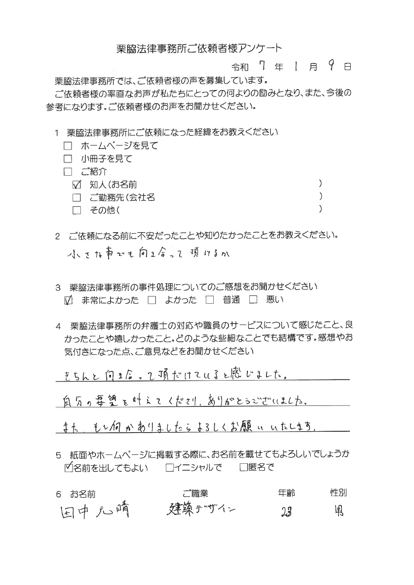 栗脇法律事務所へご依頼されたお客様から頂いた声を一部ご紹介いたします。