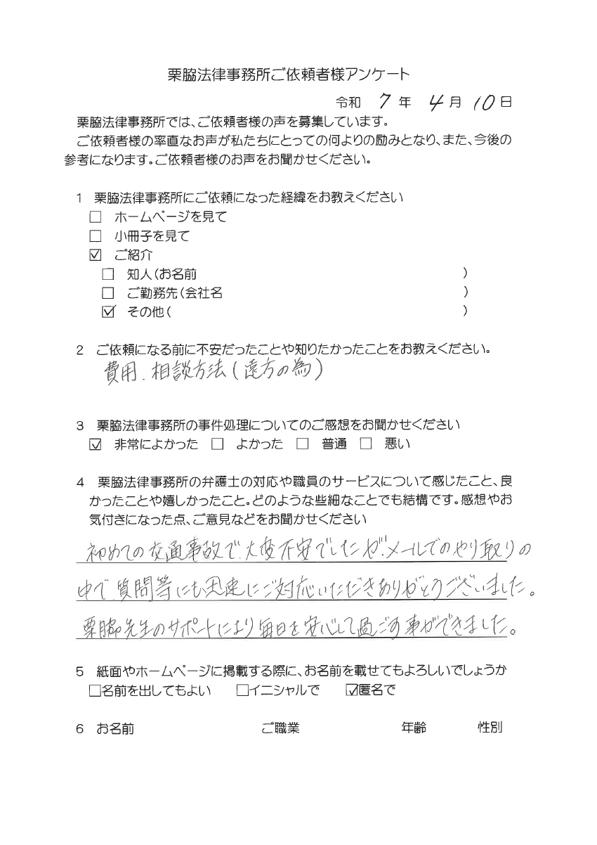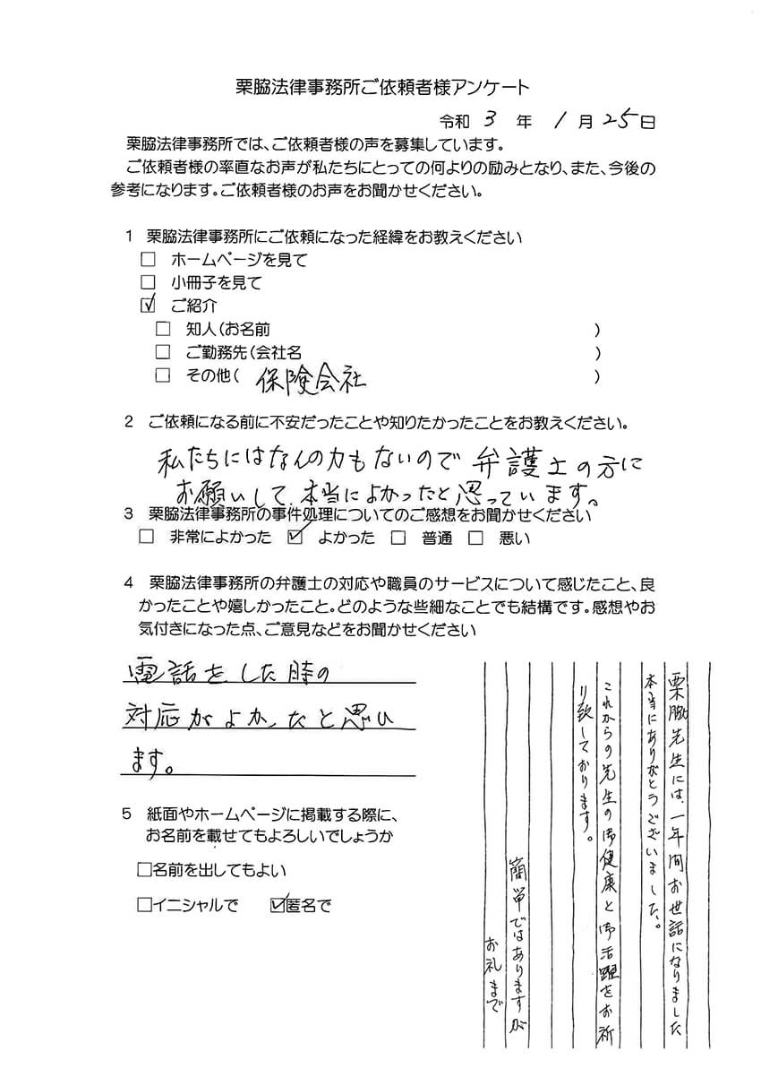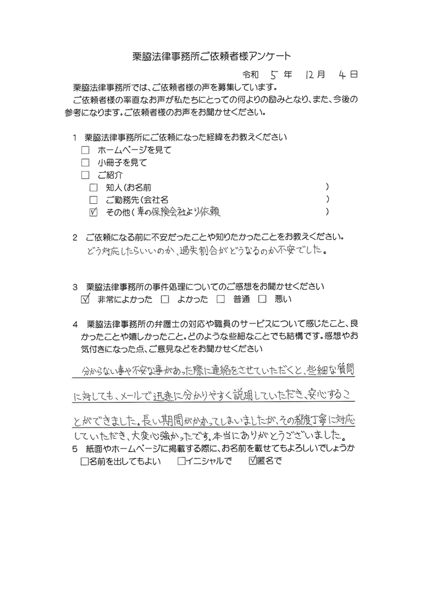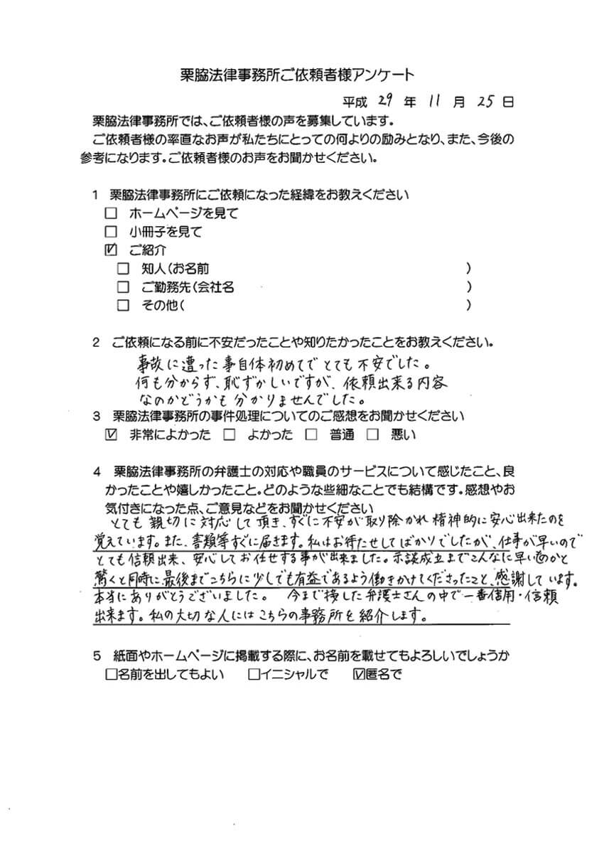 アンケート用紙には申し訳なくてとても書けないのでお手紙にさせて頂きました。この度は大変なお力添えを頂き本当にありがとうございました。事故直後の相手方の対応に「あてられ損」になるのではと、不安と憤り情なさを感じ苦しむ中、加入する保険屋さんから、有能な弁護士の先生をと紹介して頂き、どれだけ救われたか分かりません。スピード感と誠実あふれるご対応のお陰で最高の賠償金を勝ち取って頂き、感謝の思いで一杯です。弱者を守るお仕事をされるお姿は尊く心から尊敬申し上げております。貴所のさらなるご繁栄をお祈り申しあげますとともに今後とも何卒よろしくお願い申し上げます。