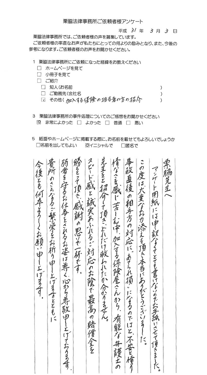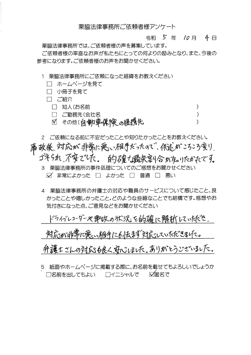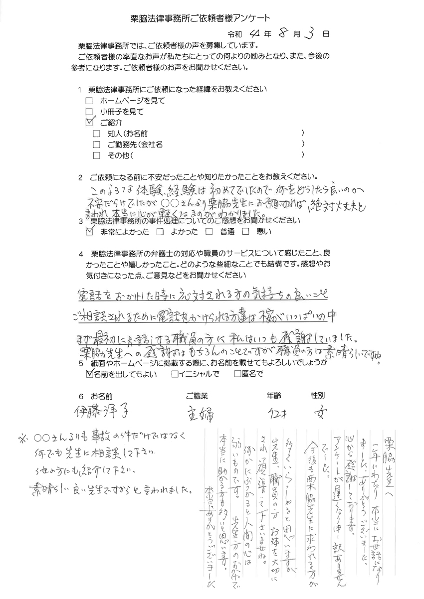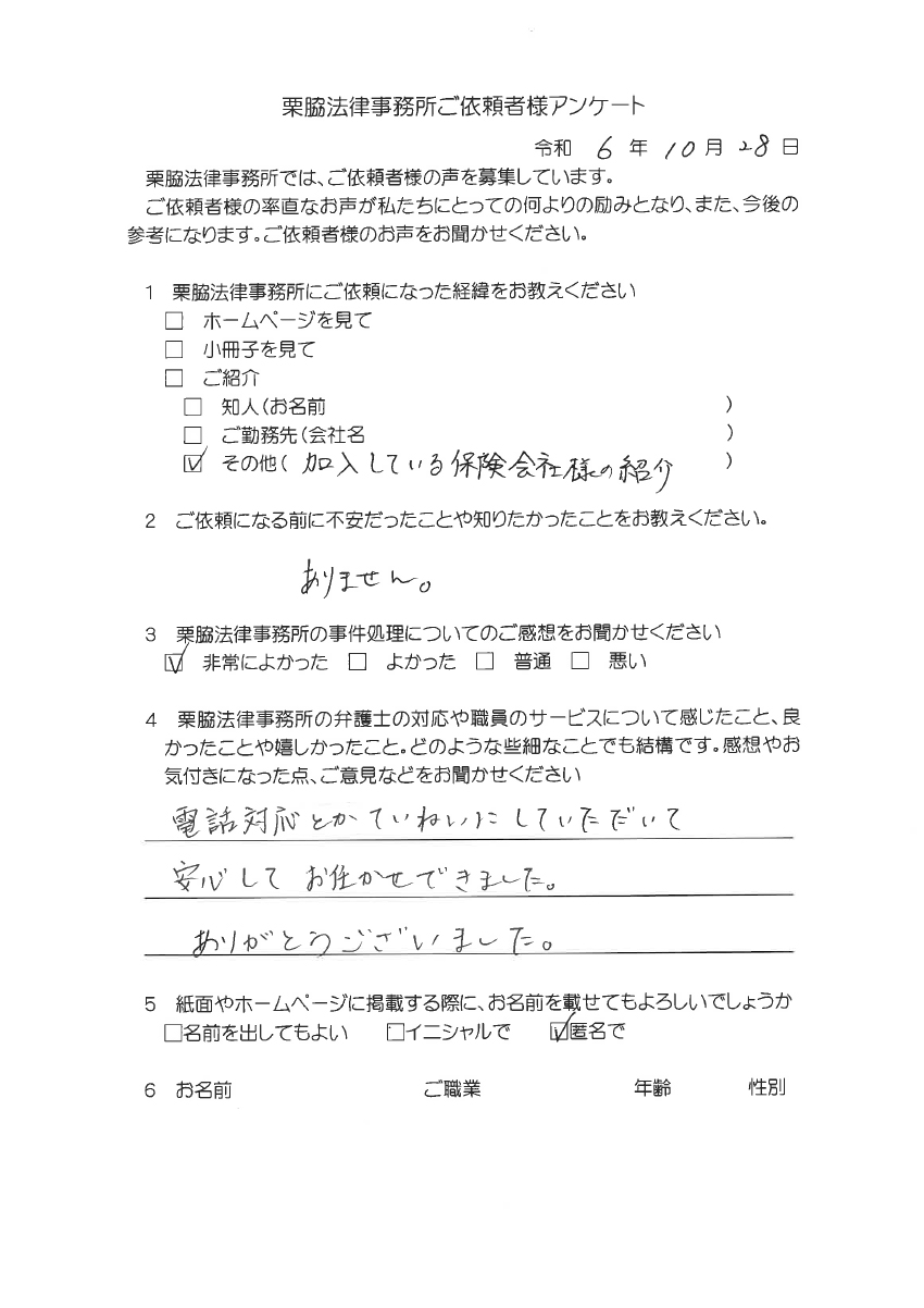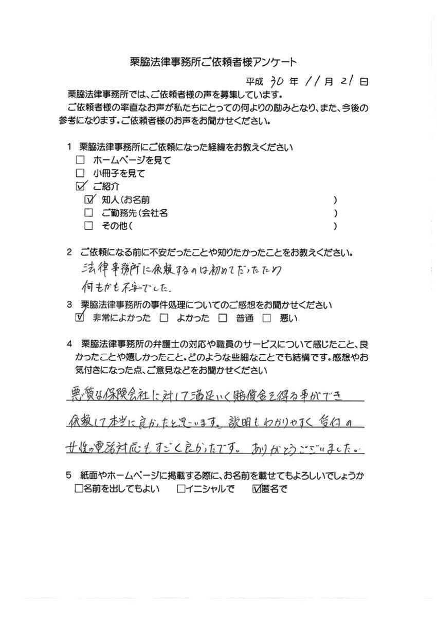 アンケート用紙には申し訳なくてとても書けないのでお手紙にさせて頂きました。この度は大変なお力添えを頂き本当にありがとうございました。事故直後の相手方の対応に「あてられ損」になるのではと、不安と憤り情なさを感じ苦しむ中、加入する保険屋さんから、有能な弁護士の先生をと紹介して頂き、どれだけ救われたか分かりません。スピード感と誠実あふれるご対応のお陰で最高の賠償金を勝ち取って頂き、感謝の思いで一杯です。弱者を守るお仕事をされるお姿は尊く心から尊敬申し上げております。貴所のさらなるご繁栄をお祈り申しあげますとともに今後とも何卒よろしくお願い申し上げます。