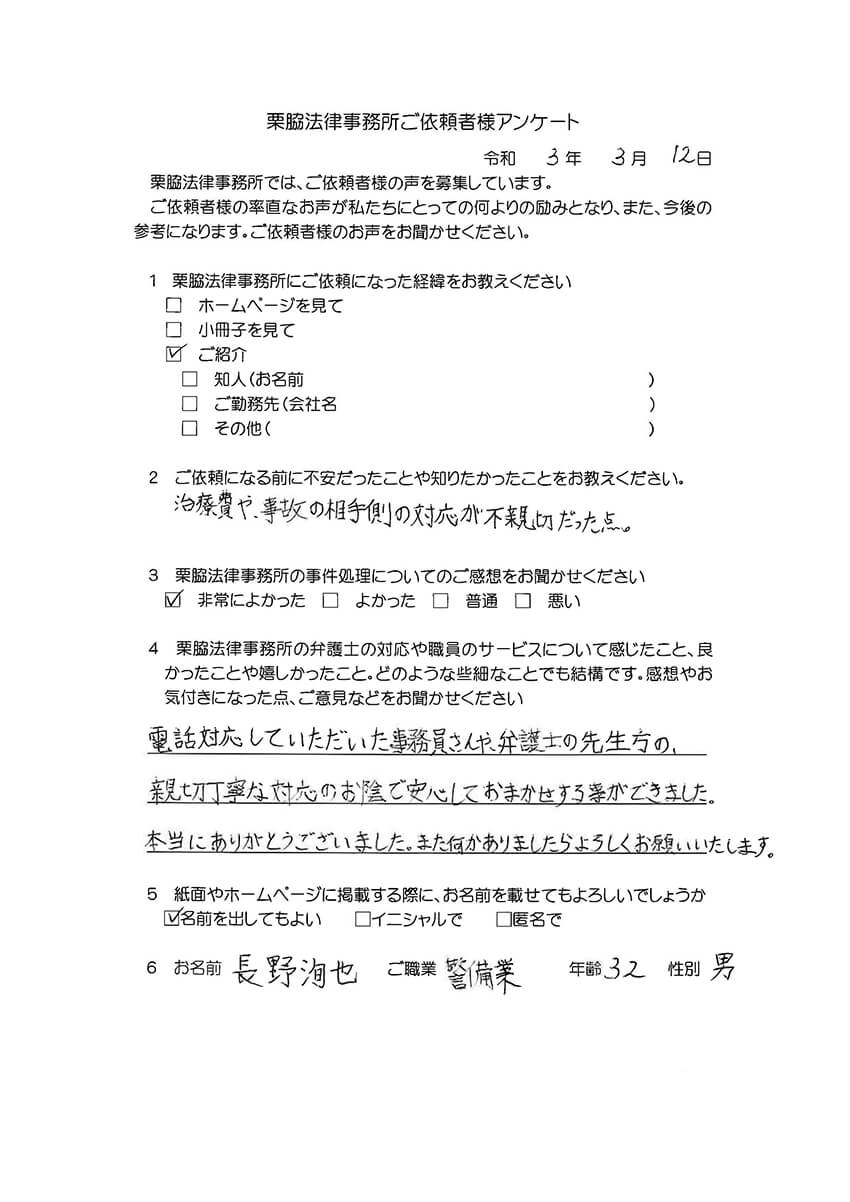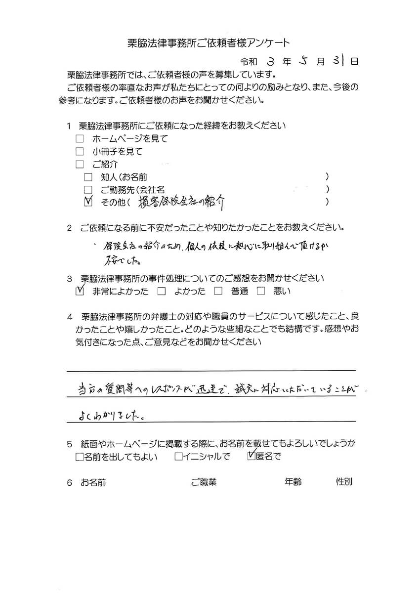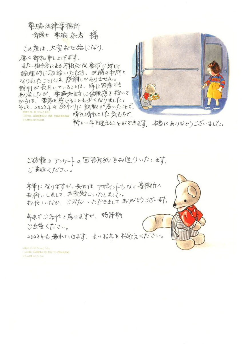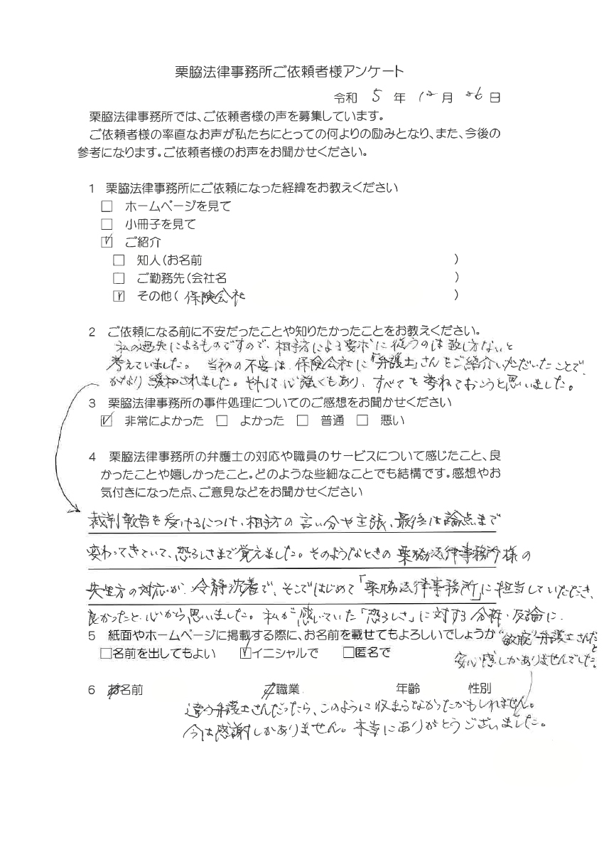 アンケート用紙には申し訳なくてとても書けないのでお手紙にさせて頂きました。この度は大変なお力添えを頂き本当にありがとうございました。事故直後の相手方の対応に「あてられ損」になるのではと、不安と憤り情なさを感じ苦しむ中、加入する保険屋さんから、有能な弁護士の先生をと紹介して頂き、どれだけ救われたか分かりません。スピード感と誠実あふれるご対応のお陰で最高の賠償金を勝ち取って頂き、感謝の思いで一杯です。弱者を守るお仕事をされるお姿は尊く心から尊敬申し上げております。貴所のさらなるご繁栄をお祈り申しあげますとともに今後とも何卒よろしくお願い申し上げます。