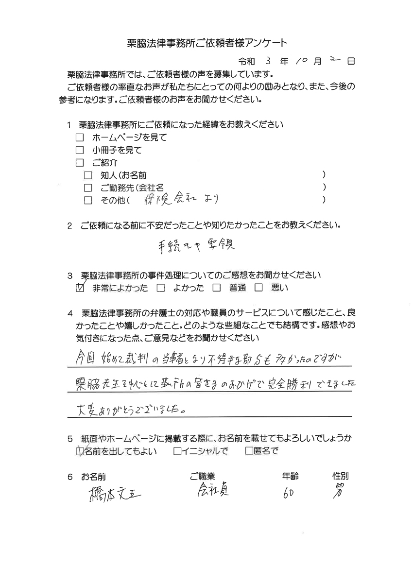 裁判にあたっては、関係ヶ所に対してのデータ収集と分析・評価に基づいた的確な主張をしていただいたおかげで勝訴になり本当にありがとうございました。また、職員の電話対応もワンコールでとっていただき、名前もしっかり覚えてアナウンスしてもらったうえに迅速な取次ぎに感謝申しあげます。